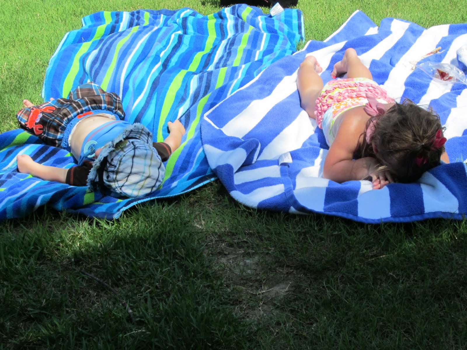 …sitting on the grass…as far away from the beach as they could get. Kensington screamed the whole time we were there that it was too dirty. The minute she stuck one toe in the sand, she said “too dirty, let’s go home”. I drug her out there, I made her play, I listened to her repeat over and over again, “it’s too dirty, let’s go home”. I mean, come on…this is the kid who has already been to Hawaii…she should LOVE the beach. But no, we sat in the grass. I could have just walked her out to the front yard to do that. Ohhhh…the thought process of a one year old girl.