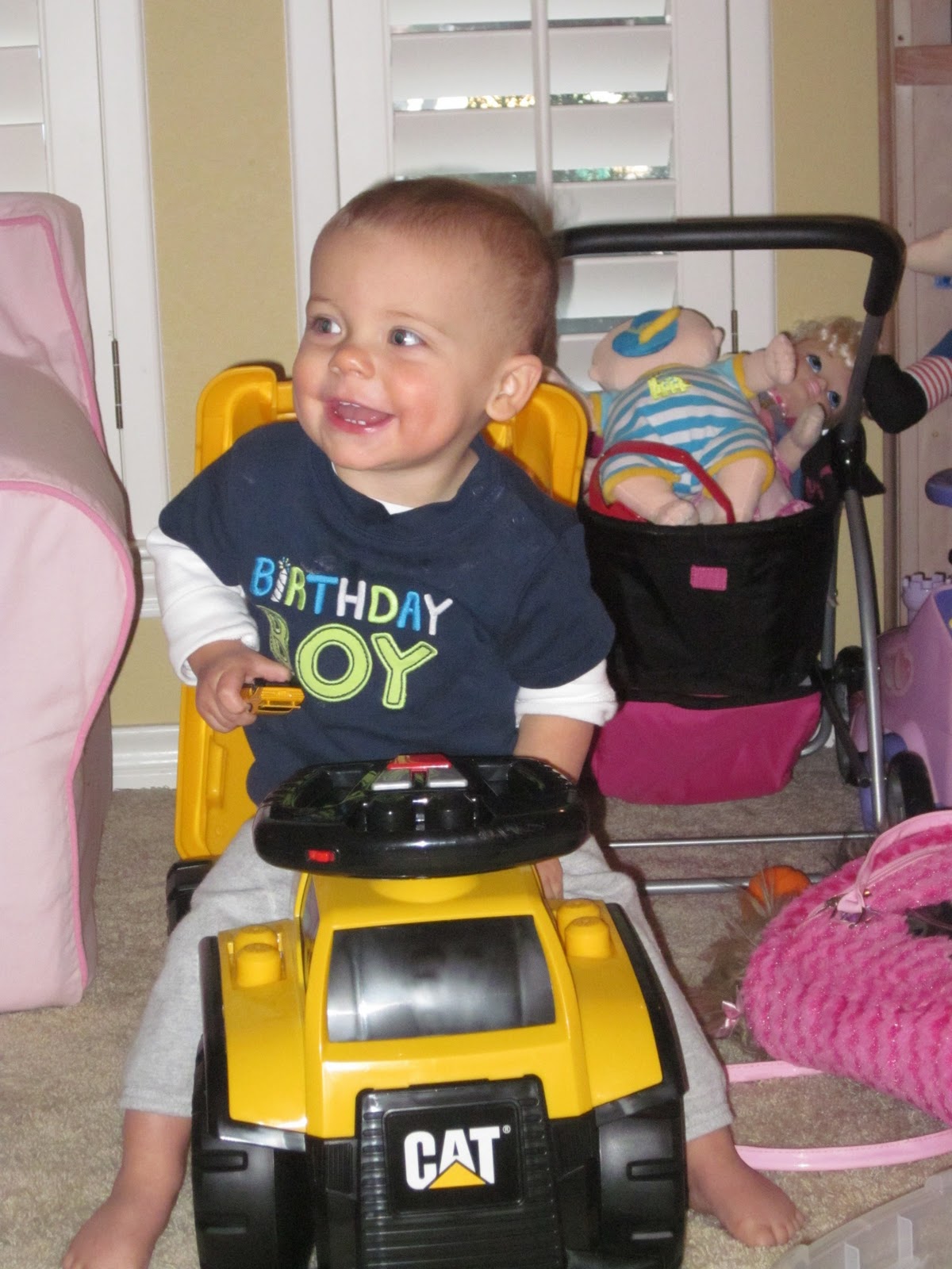 Yesterday, some of our sweet friends gave Smith a bunch of “boy toys” for his birthday. He usually gets stuck playing with Kensington’s stuff, so my friends really wanted him to have some boy stuff. We played and played all day with his new trucks and cars.