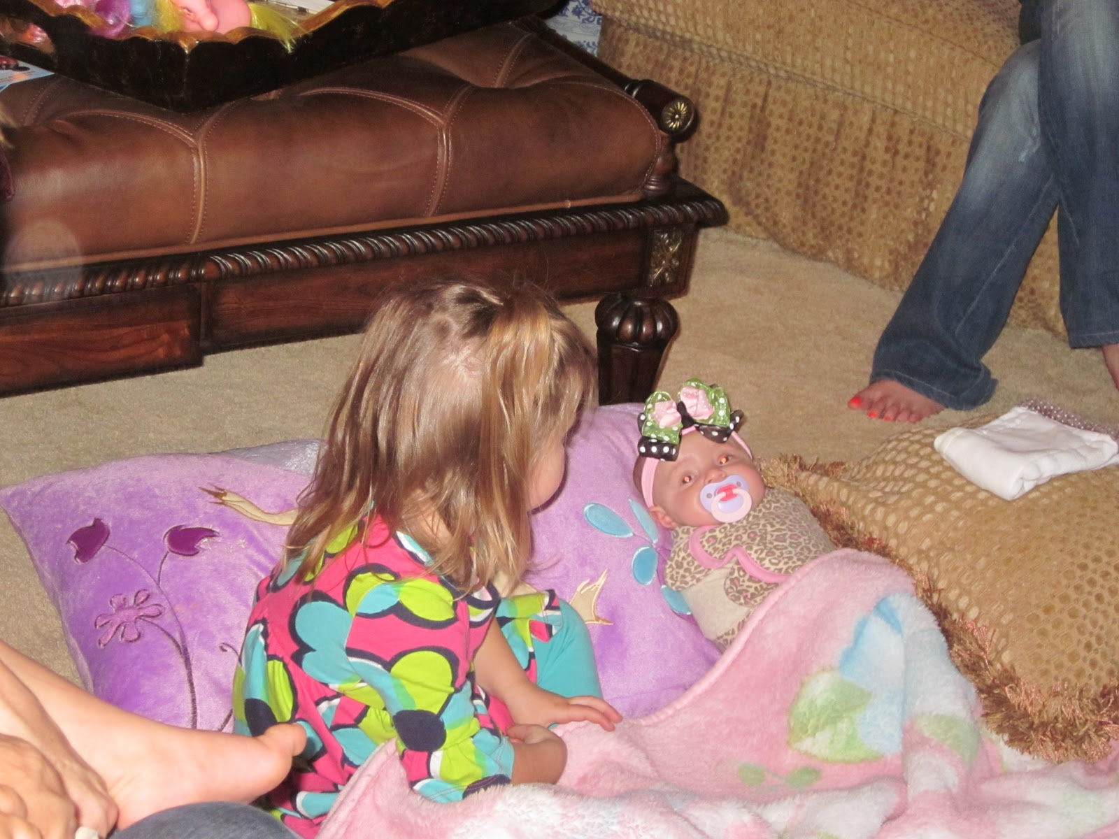 Then Kensington asked if Paisley could watch Tangled with her. This was their first time to watch a movie together :). Here she is covering her up. She shared her special pillow and blanket with her.