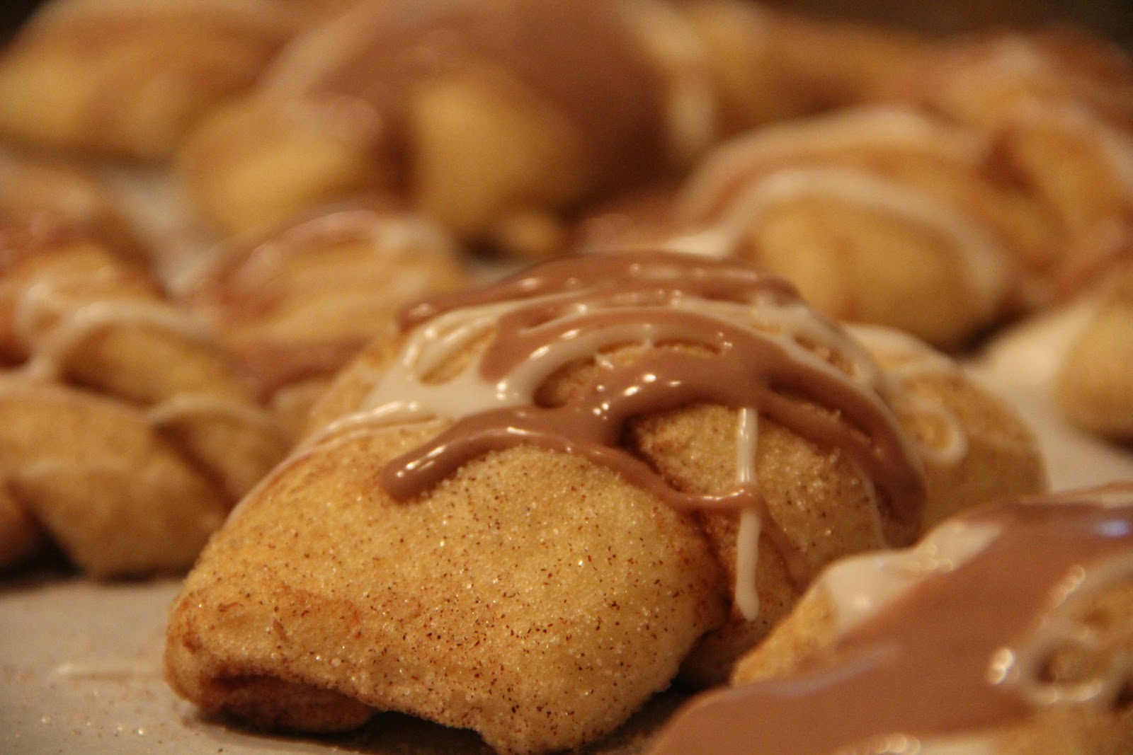 In a mixing bowl, combine sugar and cinnamon. Take each crescent roll triangle (8 per can…so take them one at a time) and dredge them in the cinnamon sugar mixture. Roll up into a crescent. Repeat for remaining.