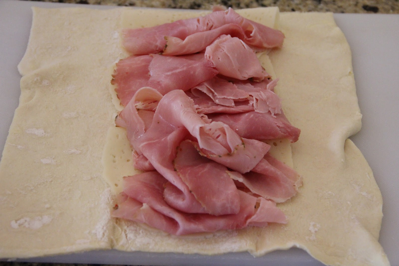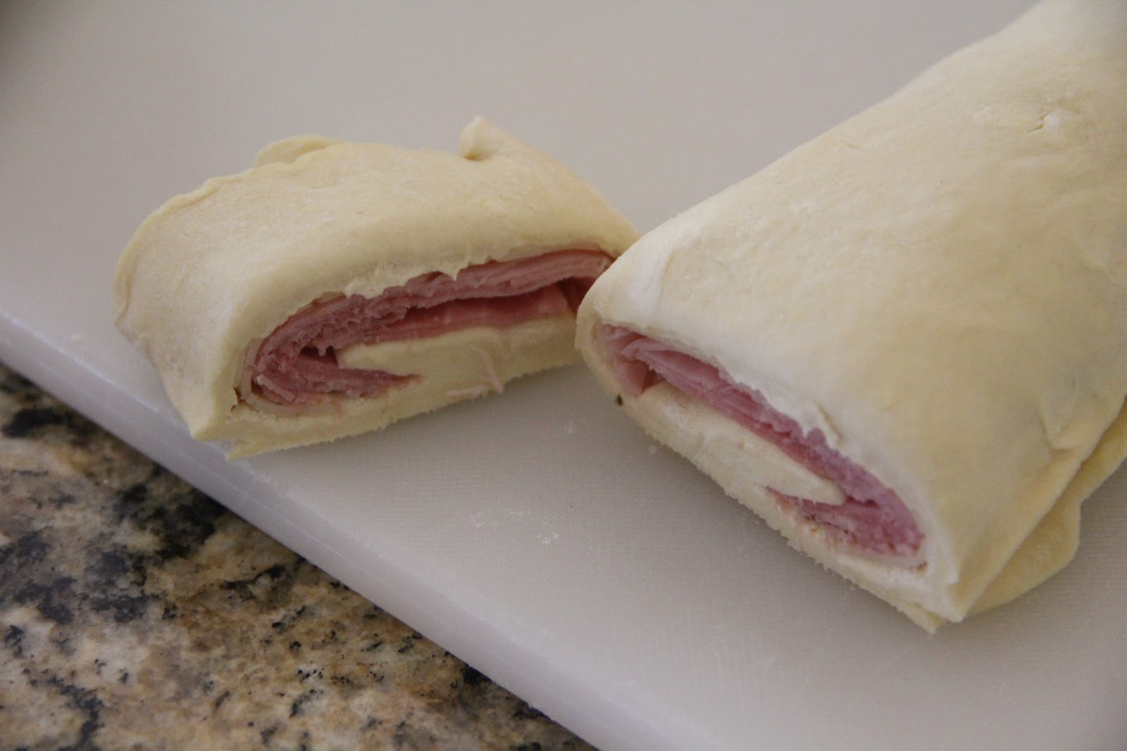 Then you cut the rolled up pastry into pinwheels. See the yummy cheese and ham inside?!