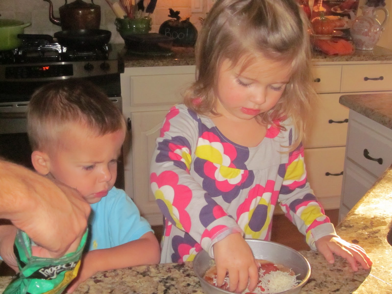 I recently blogged about our Sunday night pizza routine. Well last night, we pulled out two little individual pizza pans and let Smith and Kensington make their own. They LOVED it. My two little chefs stood on the stool and created their own little pizzas, then they waited and waited the 8 minutes for them to finally be cooked in the oven. Dinner time was extra special last night.