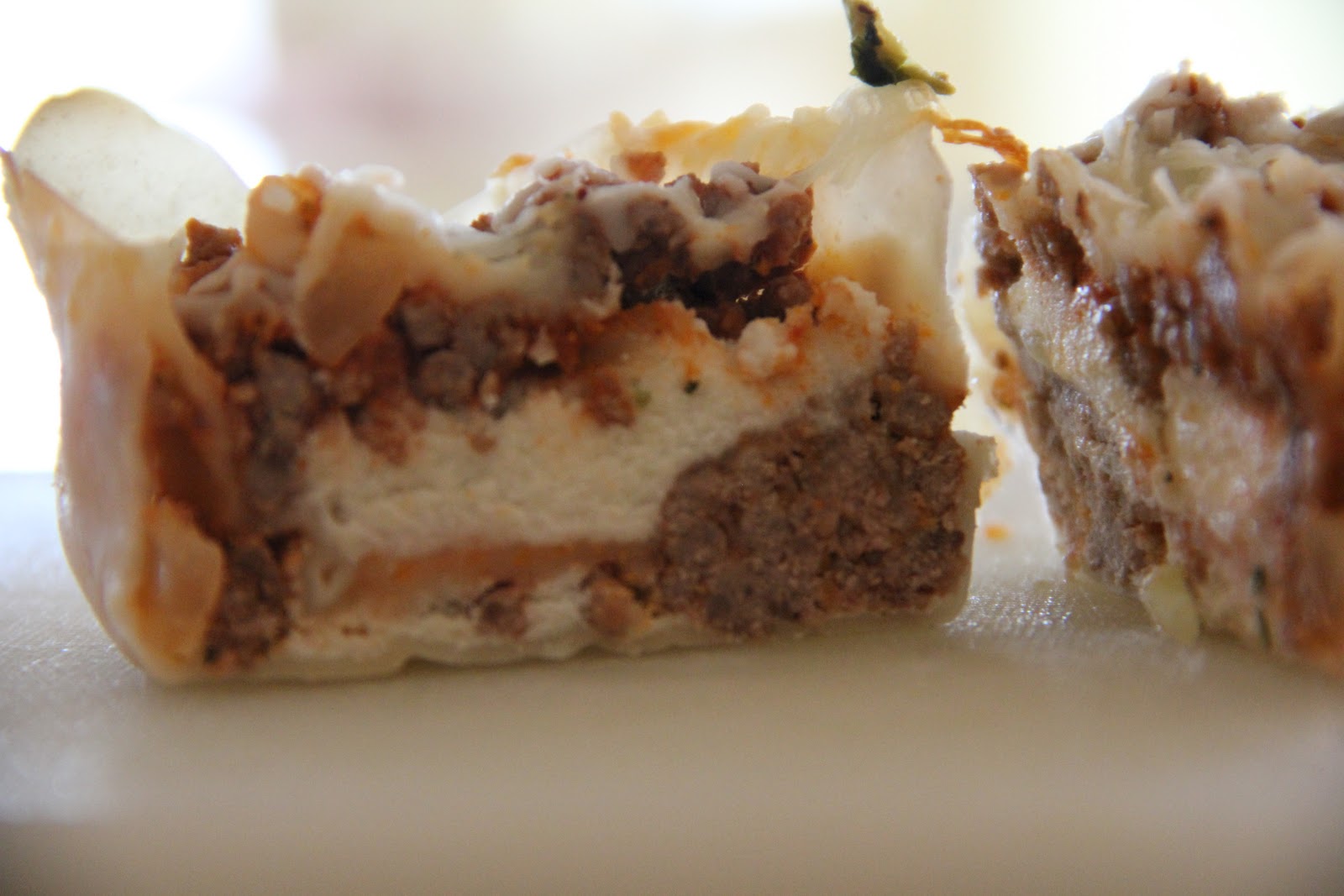 Using half of the ricotta mixture, divide it among the 12 muffin cups. Next, using half of the ground beef mixture, spoon it evenly over each of the ricotta filled cups. Sprinkle with 2 tsp of mozzarella.
