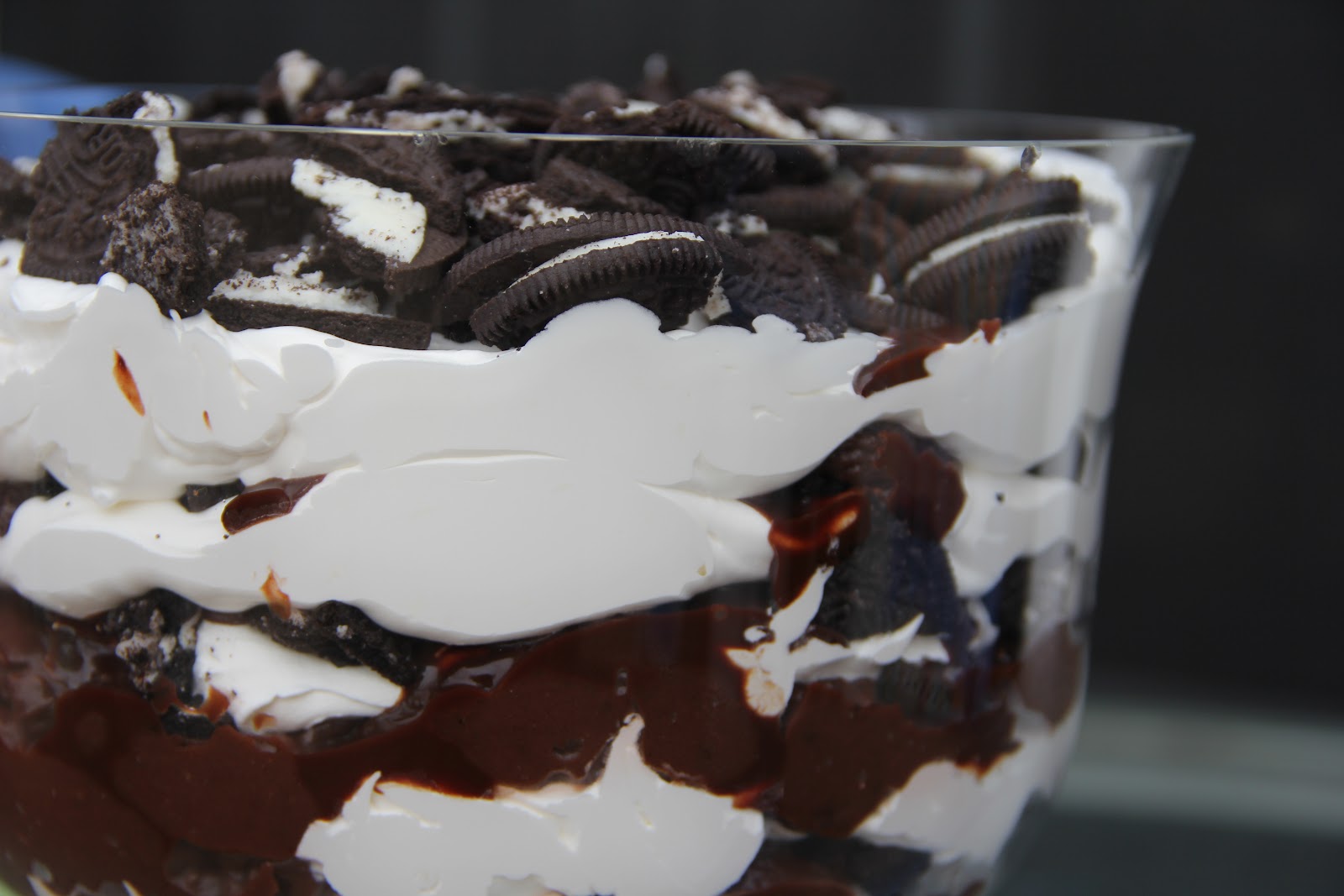 In a mixing bowl, whisk pudding with milk for about two minutes. Cover and put in fridge to firm at least 5 minutes. In a second mixing bowl, combine Cool Whip and cream cheese. In a large trifle dish or big bowl, sprinkle a layer of crushed cookie over the bottom. Add a layer of pudding, then a layer of Cool Whip mixture, then a drizzle of chocolate syrup…then repeat as many times as you like (I made 4 layers). End with the Cool Whip mixture on top, a drizzle of syrup over that and cookies as the very top layer.