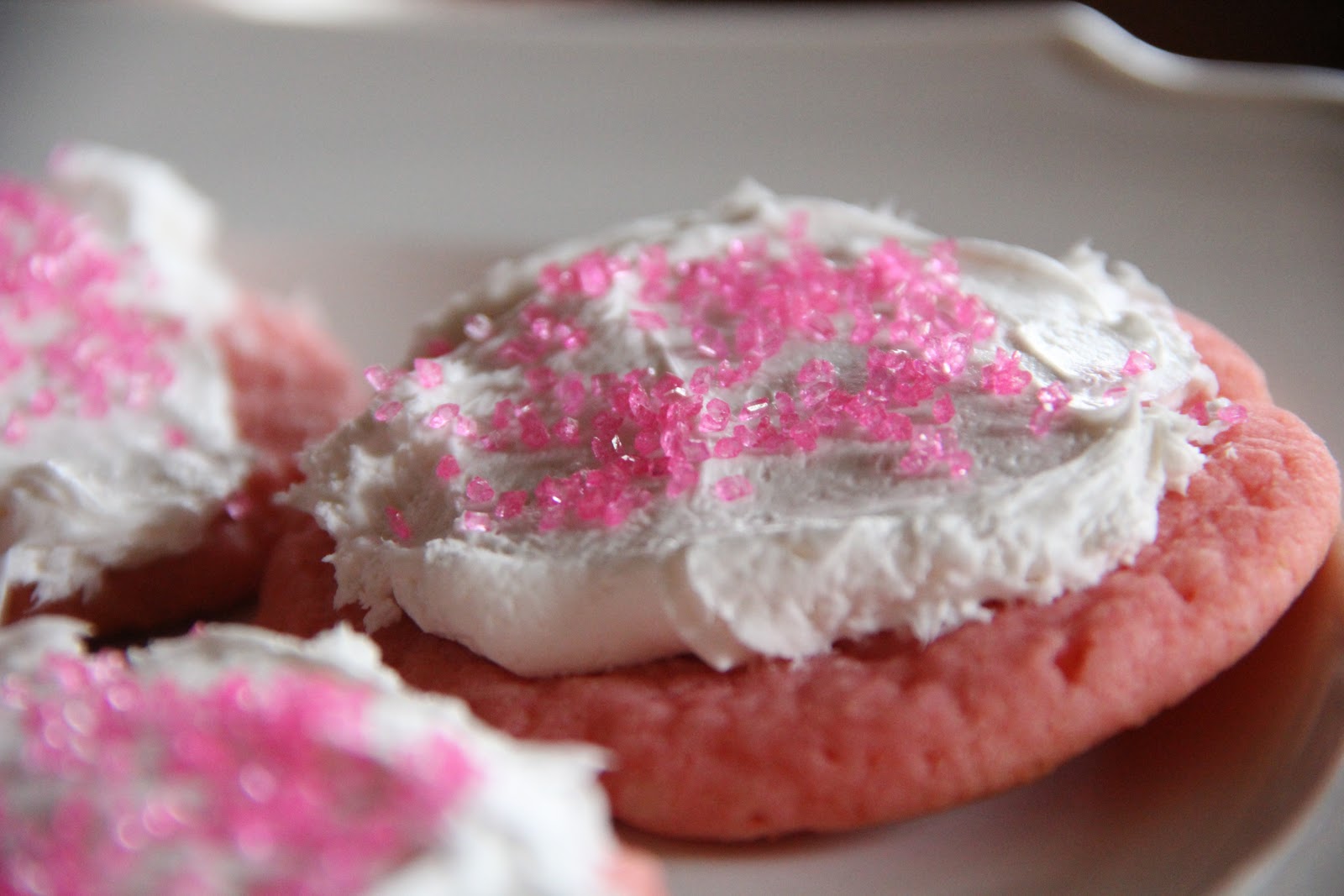 Drop dough by tablespoon fulls onto greased baking sheet. Bake 8-9 minutes. Cool on cooling rack. Once cooled, spread frosting over each cookie and top with pink sprinkles.