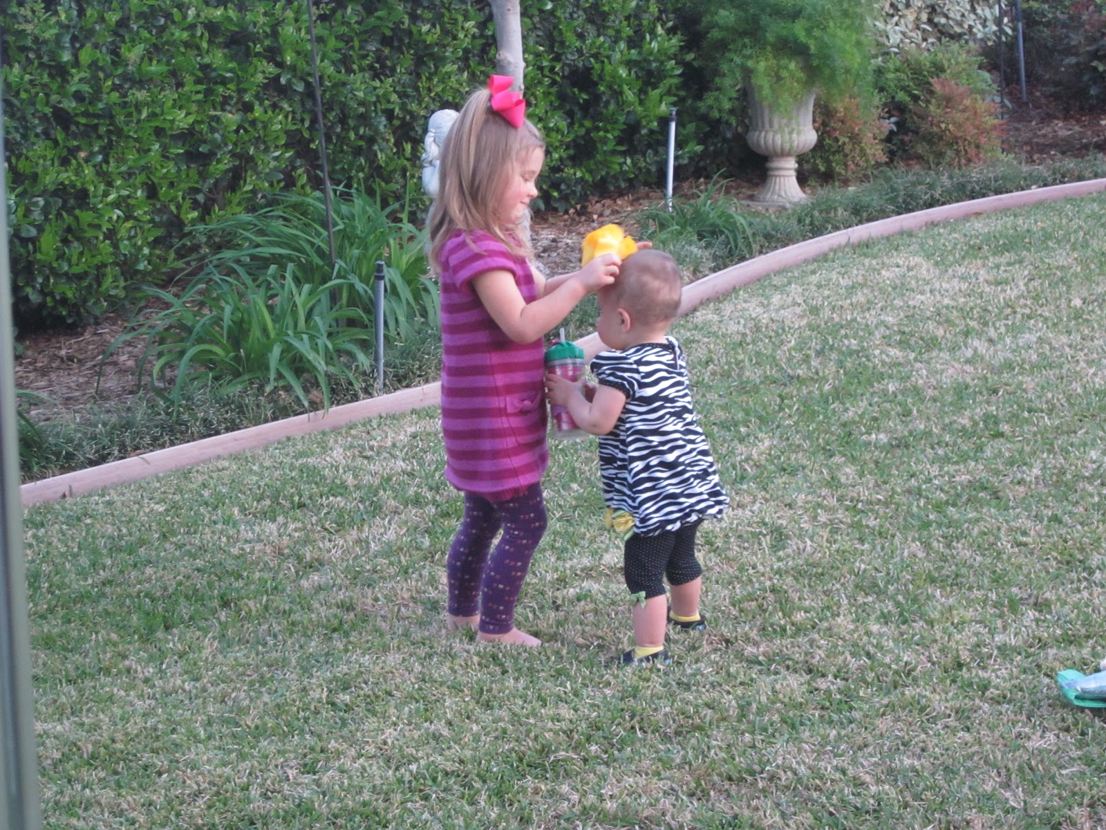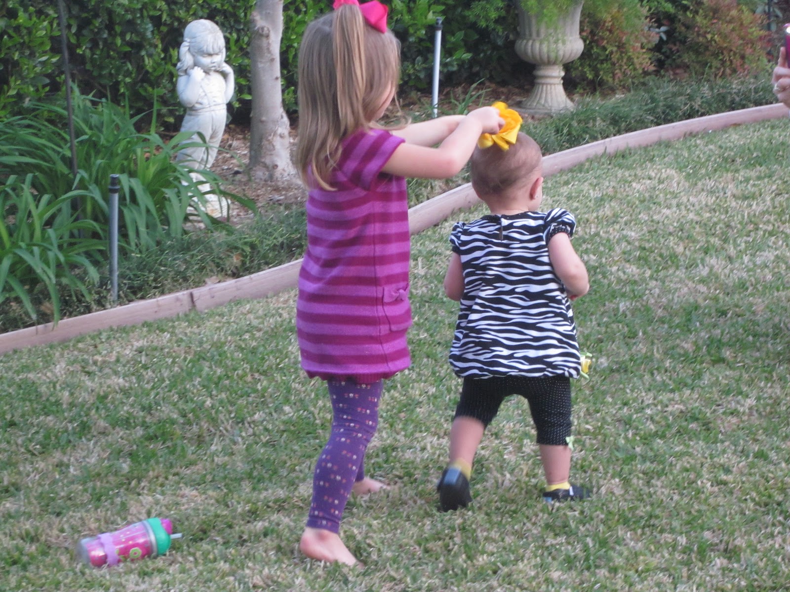 Kensington was in the yard trying to help her cousin Paisley get her head band back on.