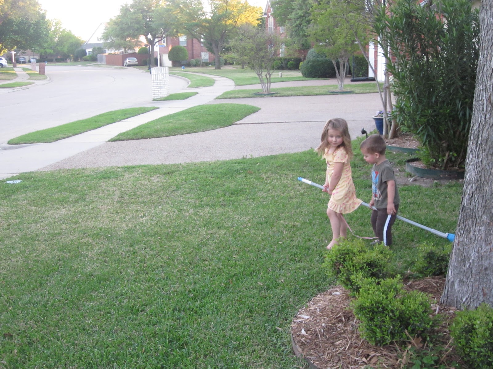 Last night, we had burgers in the backyard and then played in the front yard. Here are my kids riding their “horse” (a.k.a. the broom). They did this forever!