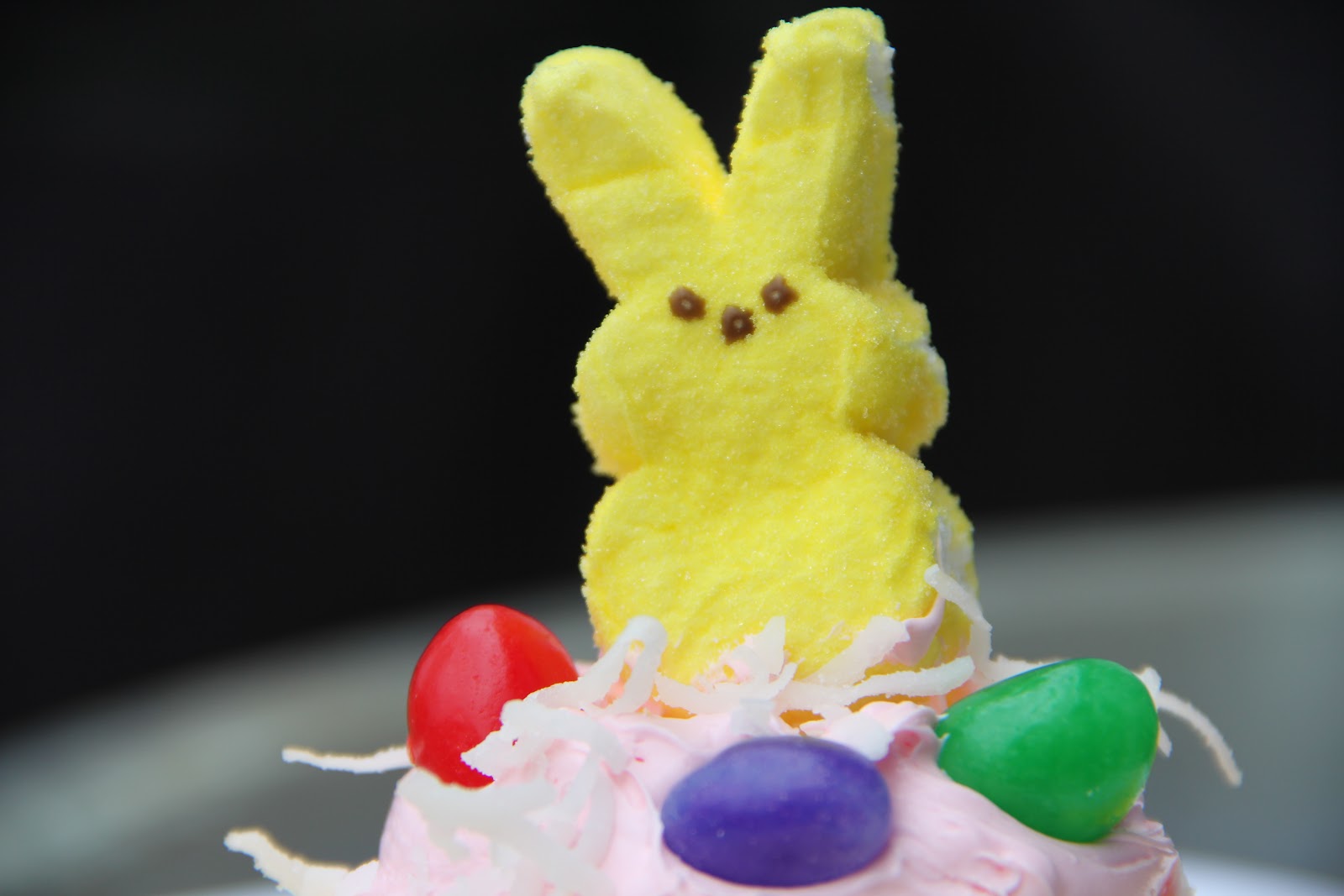 Prepare cupcakes as directed by boxed mix. Once cooled, top cupcakes with store bought strawberry icing, coconut, jelly beans and Peeps.