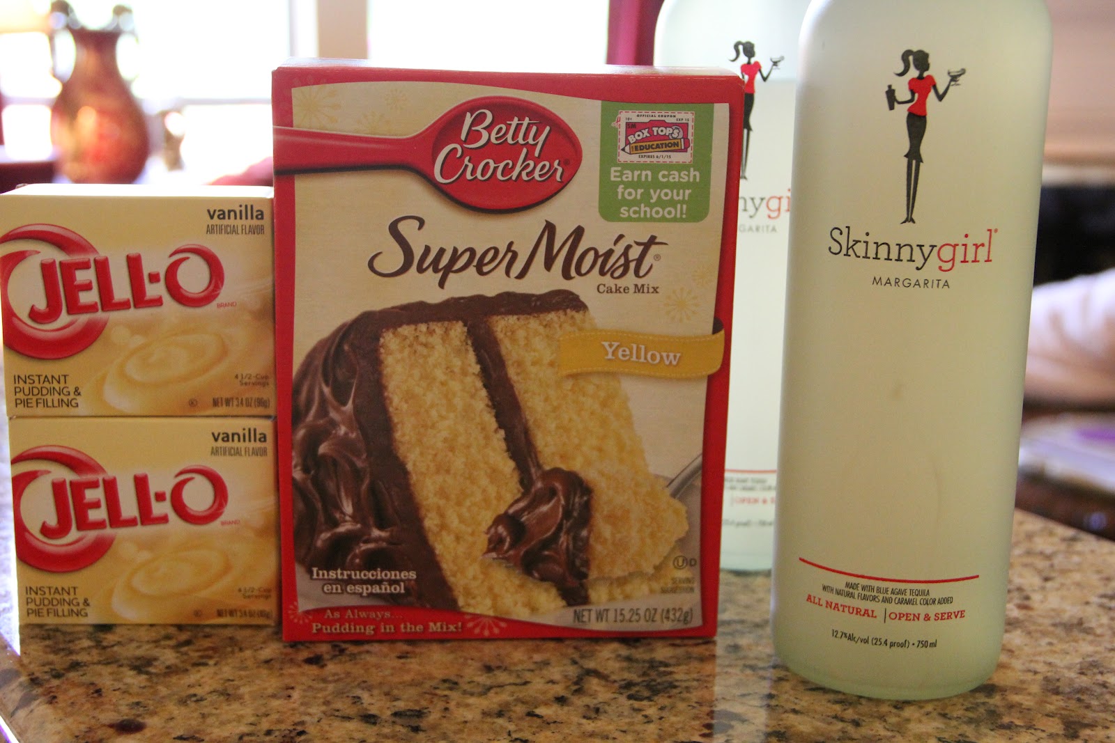 In mixing bowl, combine cake mix, puddings, oil, 1 1/4 cup Skinny Girl and eggs with electric mixer. Pour into prepared pan and bake 40-45 minutes or until toothpick inserted comes out clean.