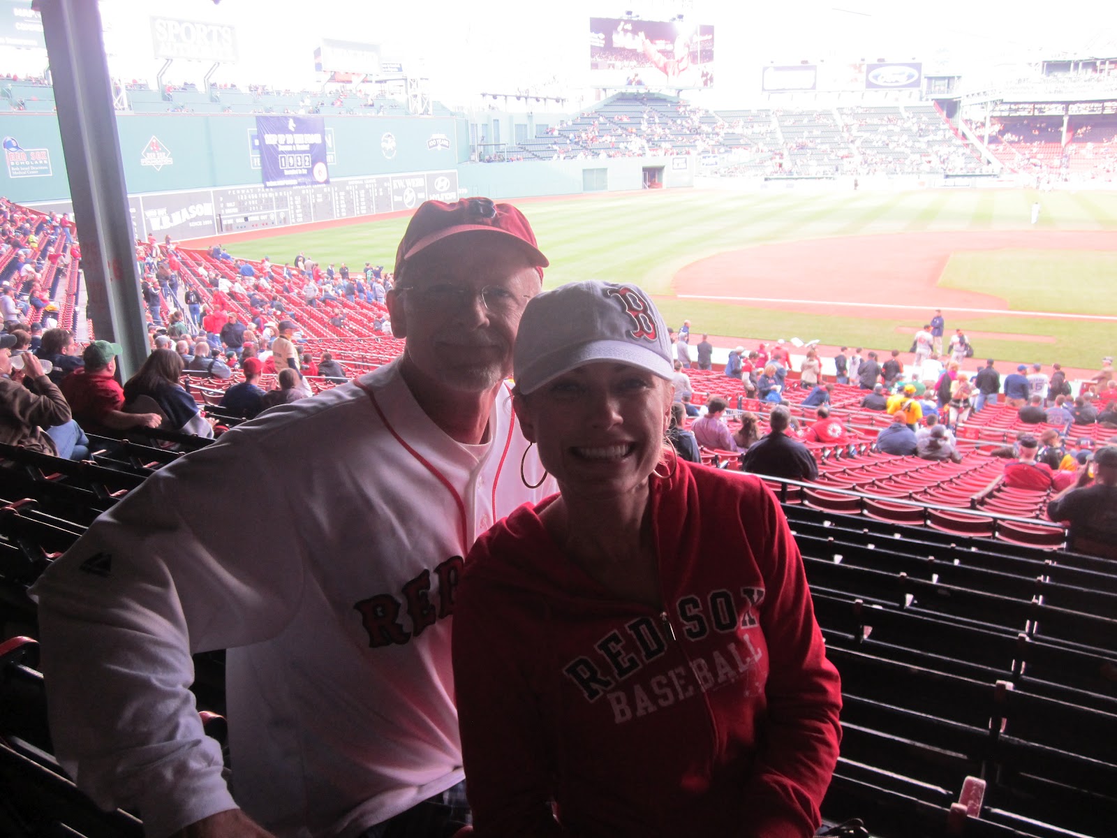 Here we are before the game sitting on either side of the famous red seat. Ted Williams hit the longest home run ever reported at Fenway Park when he hit this seat…that’s why they painted it red.