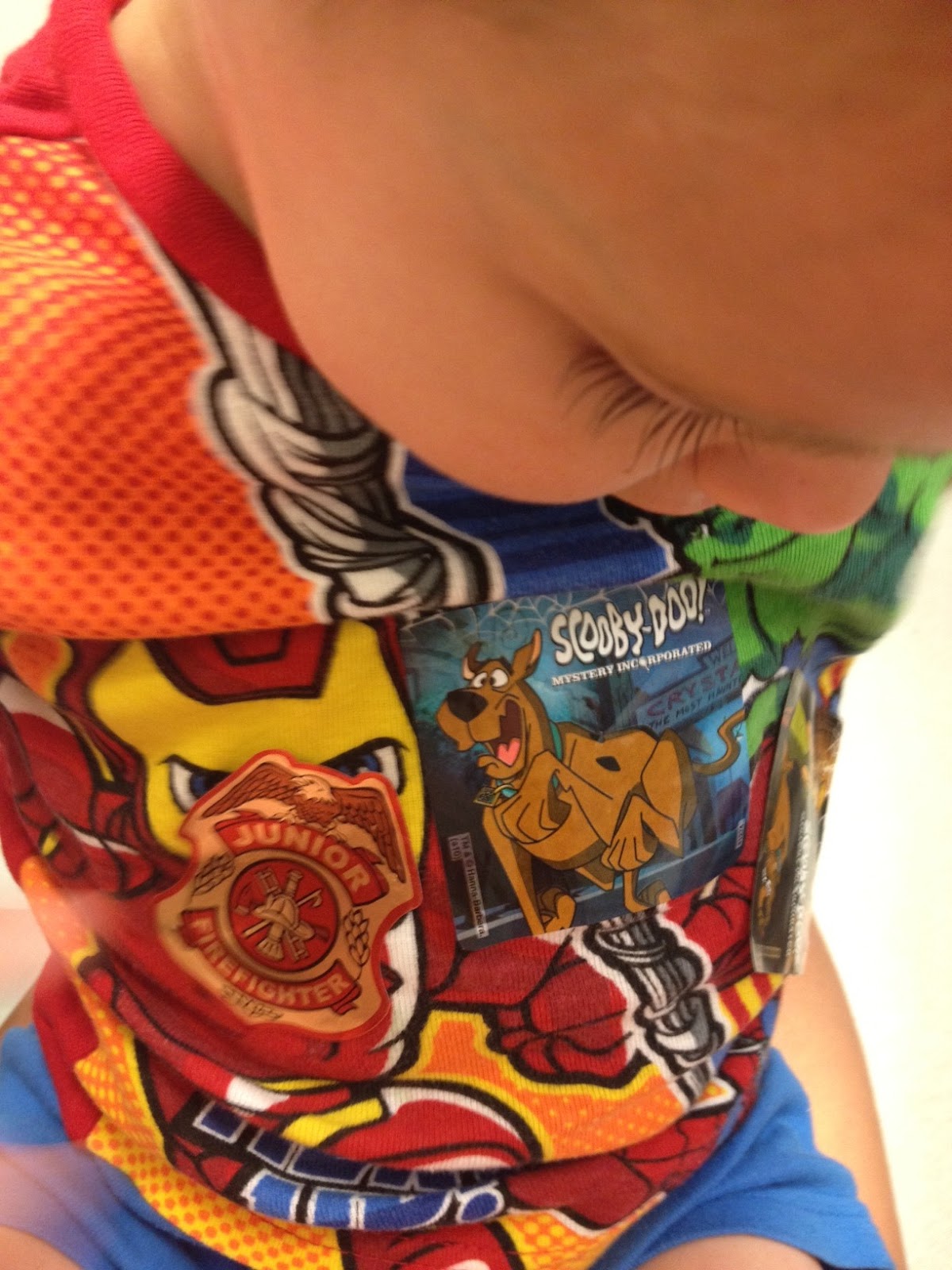 …and he had the BEST TIME EVER! This is him showing me his 4 stickers he received. He also got a green Popsicle, to meet 3 firemen, 1 police officer, 2 doctors, a nurse, got to watch the Lion King in his own private room and stay up way past his bedtime. He loved it! He was fine by the way…they wanted to make sure he didn’t have meningitis (because of the head/neck complaining) but he just had a mild ear infection. By the time Dicky came to check on him, Smith had already received a second round of Tylenol and was practically swinging from the rafters in his little room. He has already asked to go back to the ER several times.