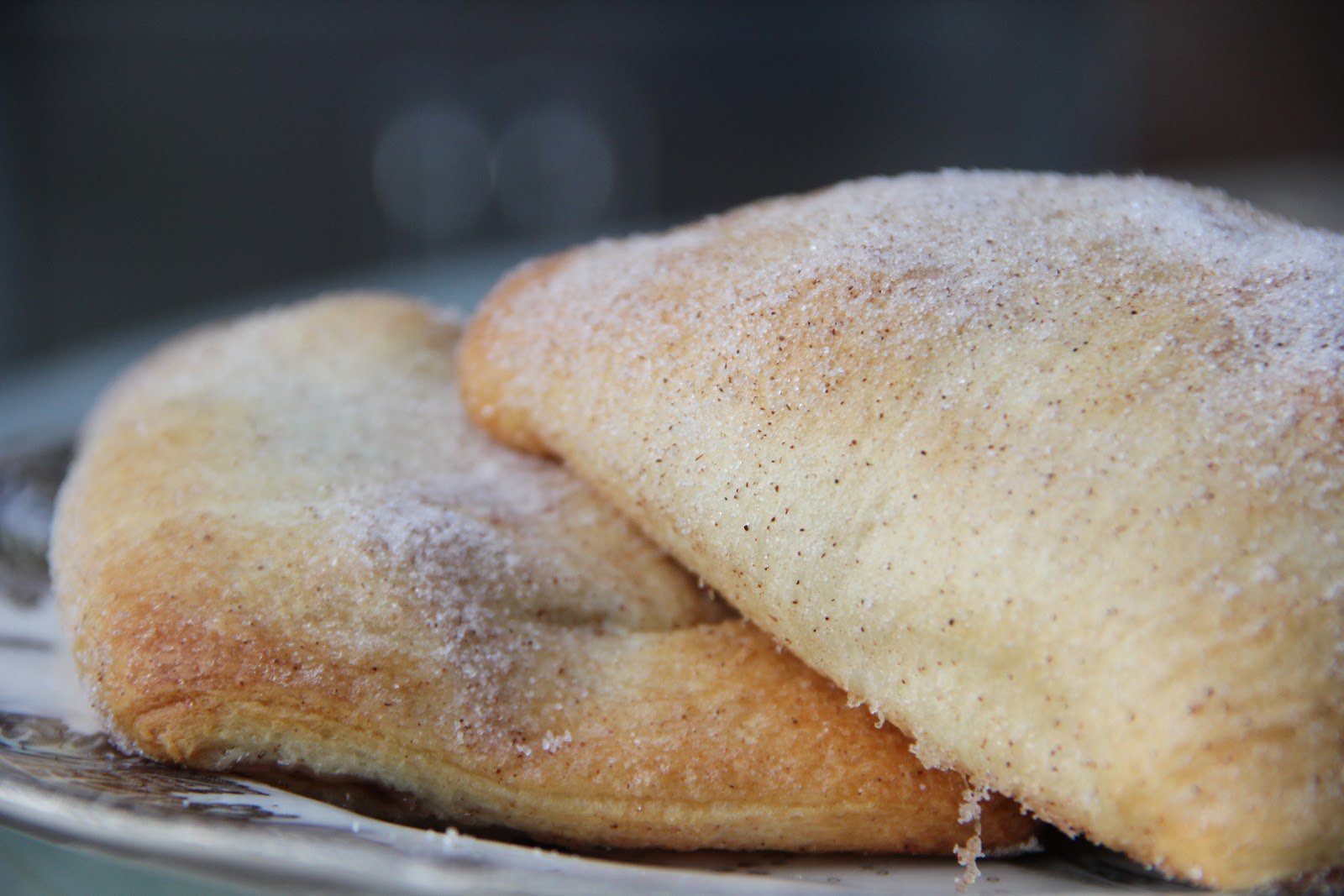 In a small bowl, combine your sugar and cinnamon. Heavily sprinkle your sugar mixture over both sides of each square. Then take about 2 tablespoons of pie filling and place it on one end of each square. Fold the other end over the pie filling and press all sides down to keep filling inside. Sprinkle tops of each turnover with additional cinnamon sugar.