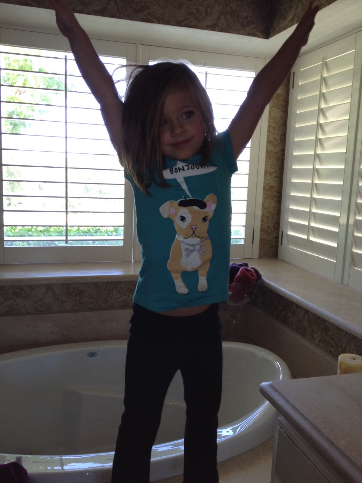 Showing off her awesome French shirt that Ms. Lori gave her for her birthday. She loves a good dog shirt and a good French shirt…this one was tres magnifique!