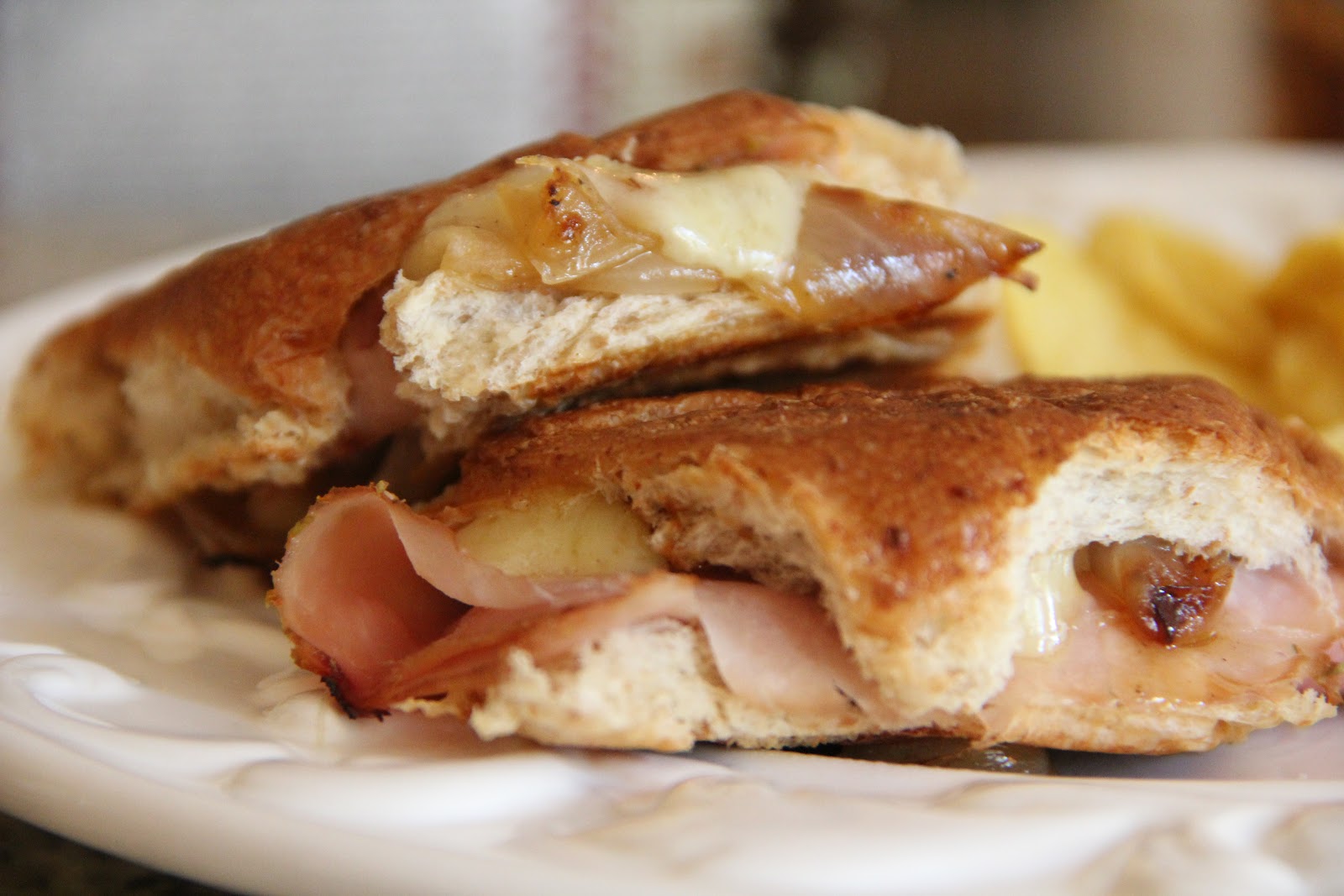 Meanwhile, preheat your panini press, griddle or another large skillet to medium-high heat. Assemble your paninis by placing sauteed onions, a few pieces of ham and Gruyere cheese inside a dinner roll. Press your sandwich under the panini press until nice and golden (about 4 minutes) or place it on a griddle or saute pan and press another skillet (something heavy) on top of it. Flip your panini after 3 or 4 minutes and repeat on the other side.