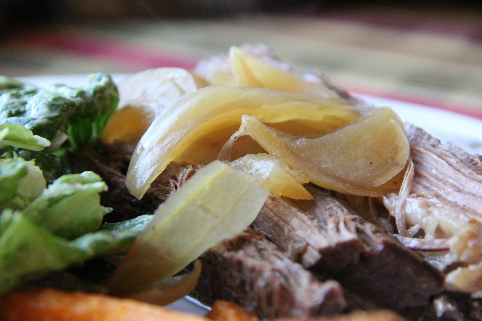 Remove brisket from slow cooker and let it rest about 10 minutes on the counter (covered with foil to keep it warm). Slice brisket and then serve it with the onions from the slow cooker.