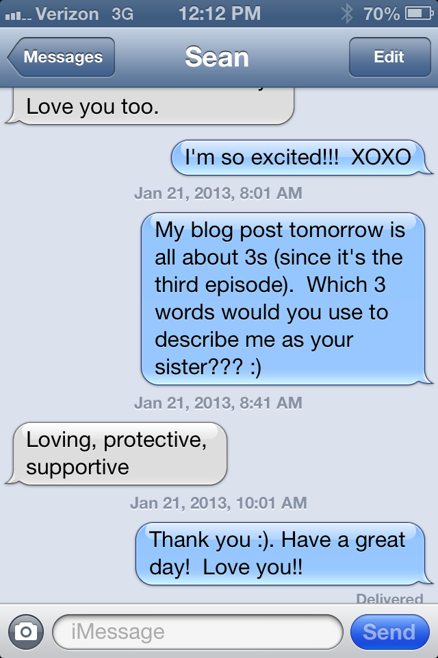 I asked Sean yesterday to describe me as his sister in 3 words. See below…