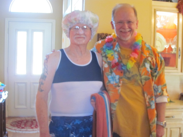 Papa and my dad…Papa is ready for a swim. He has the sunscreen down his nose and everything!