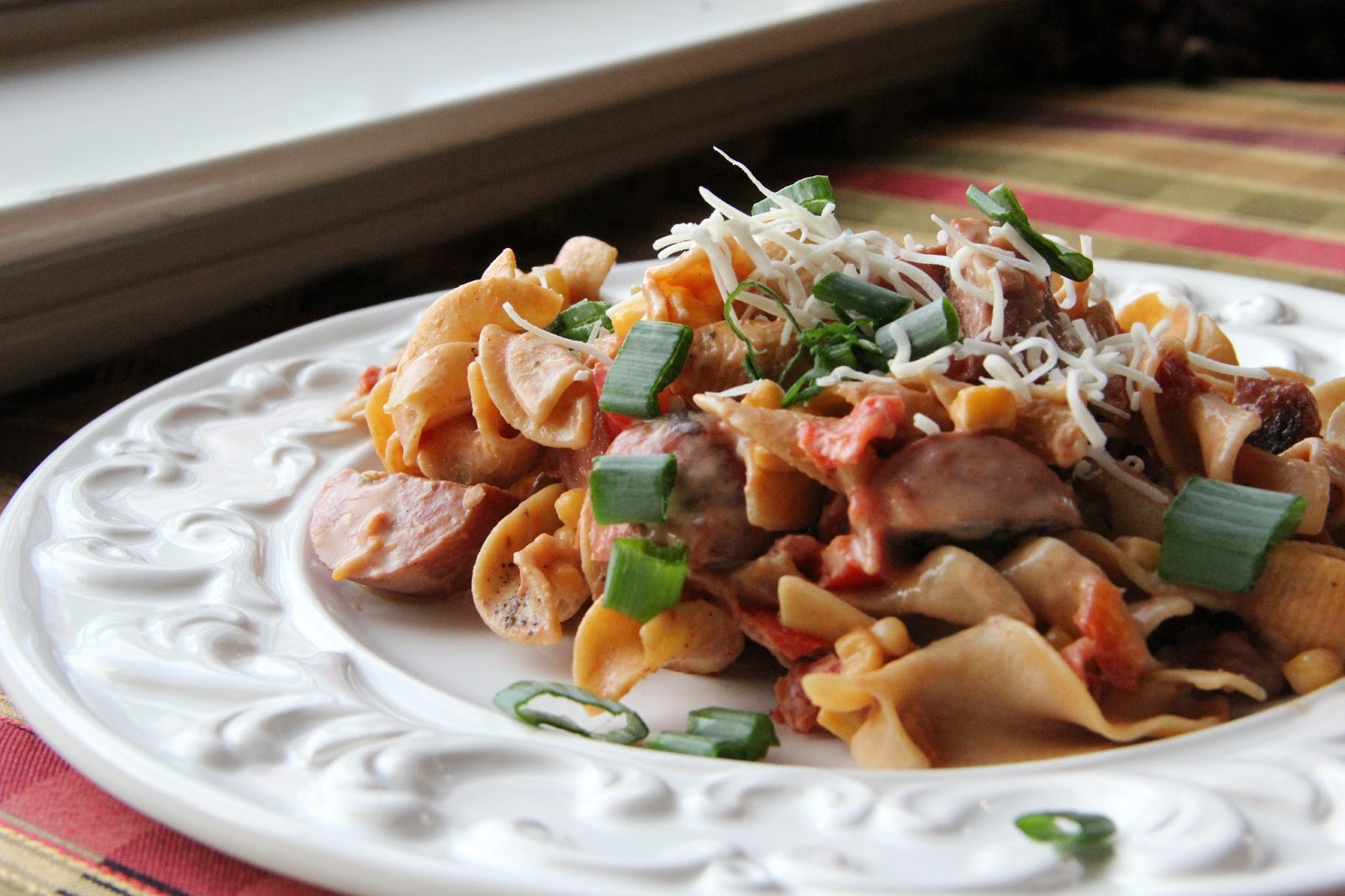 I made this with a few variations and it turned out great! I added red onion, mushrooms, and crushed red pepper and didn't use the corn since I didn't have any. I used spicy Italian chicken sausage and Also used about 2 TBSP of Greek yogurt instead of the cream- the leftovers were great took!
