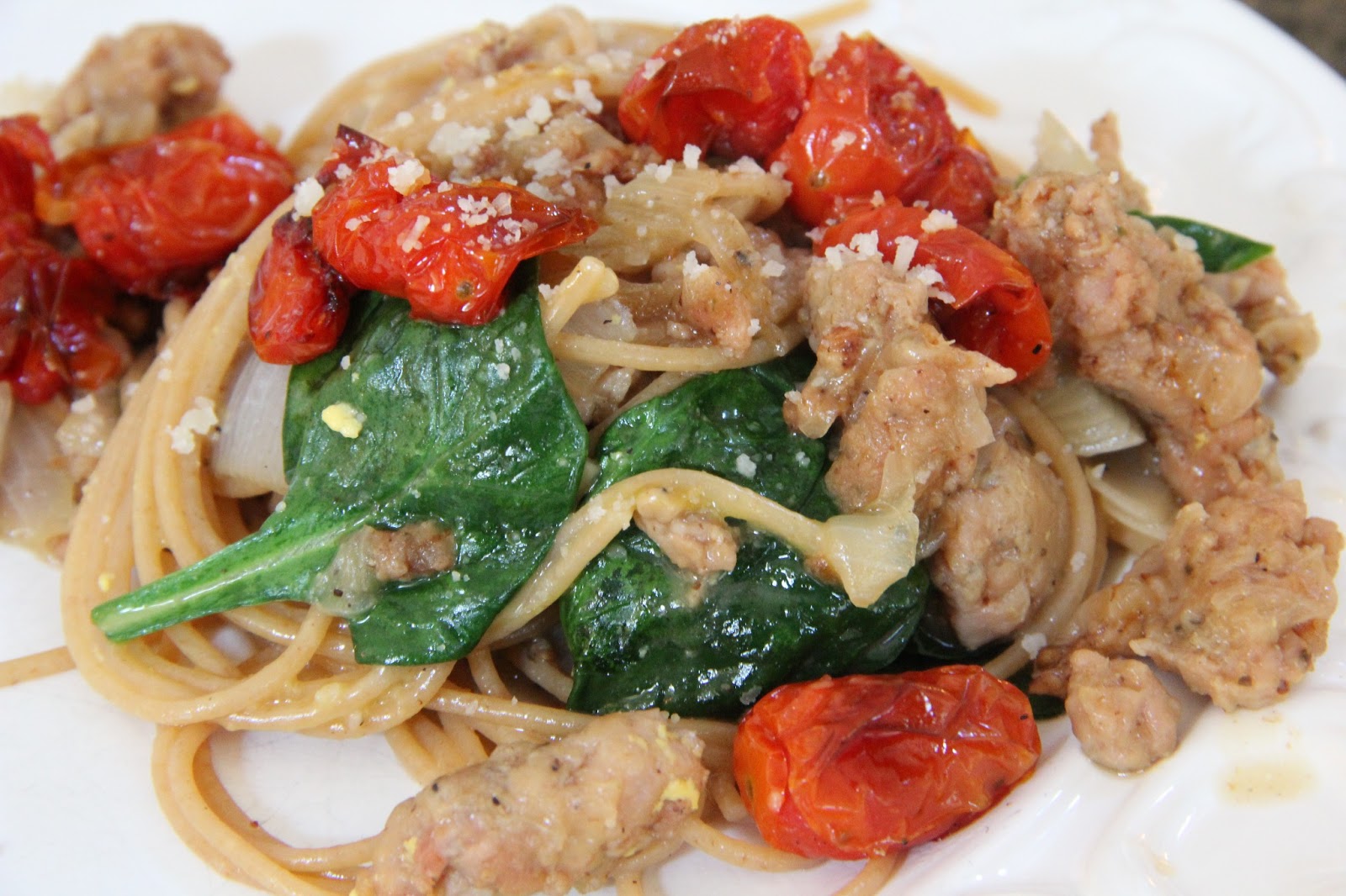 Turn skillet off and add in your tempered eggs to the pasta. Add in the roasted tomatoes from the oven, spinach, and cheese and toss until everything is incorporated with the pasta. Top with extra cheese.