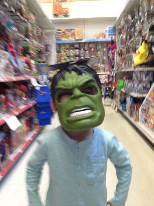 While the girls hosted the shower, the boys went to Toys R Us and tried on super hero masks. Captain America…