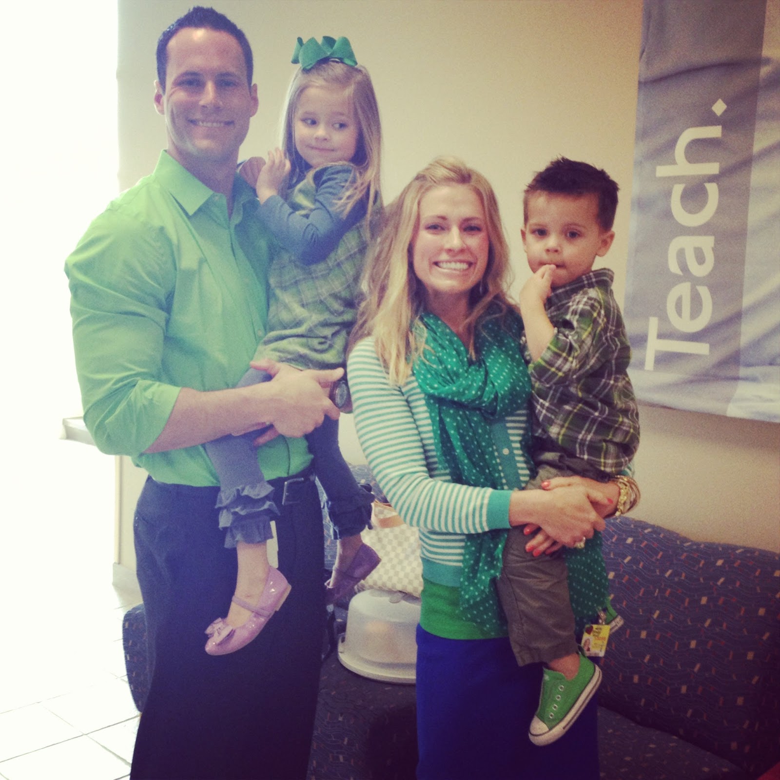 I'm watching DWTS! I think I just saw your parents in the crowd, is that right? 🙂 Love the St. Patrick's Day picture of your family of 4. What a beautiful family. My husband played college football for Navy so he towers over me as well! 🙂 Happy St. Patrick's Day to you all!