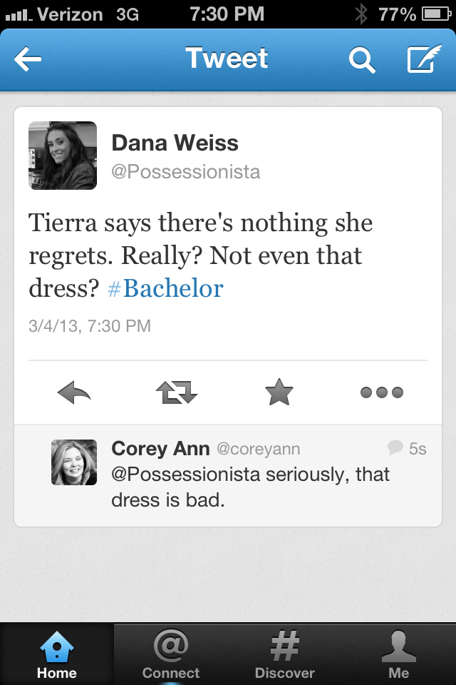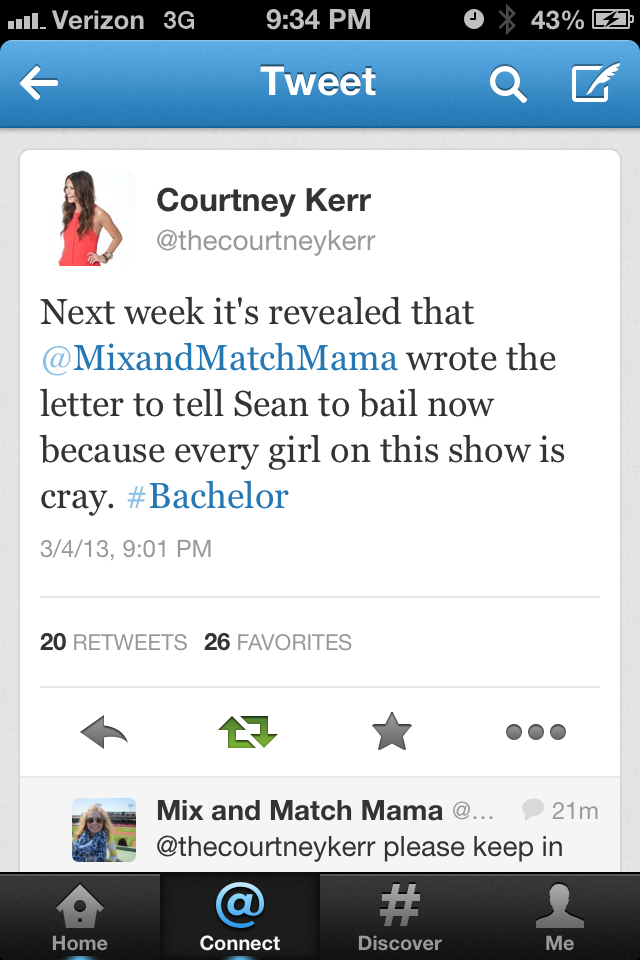 I tweet live…so as they're saying things, I tweet. At one point, she made a sweet reference to how her and I would have been good friends. Thus, the tweet you read. However, then she went on to imply that Sean was a liar…and therefore, my opinion of her changed a wee bit. I think any big sister's opinion would change under those circumstances.