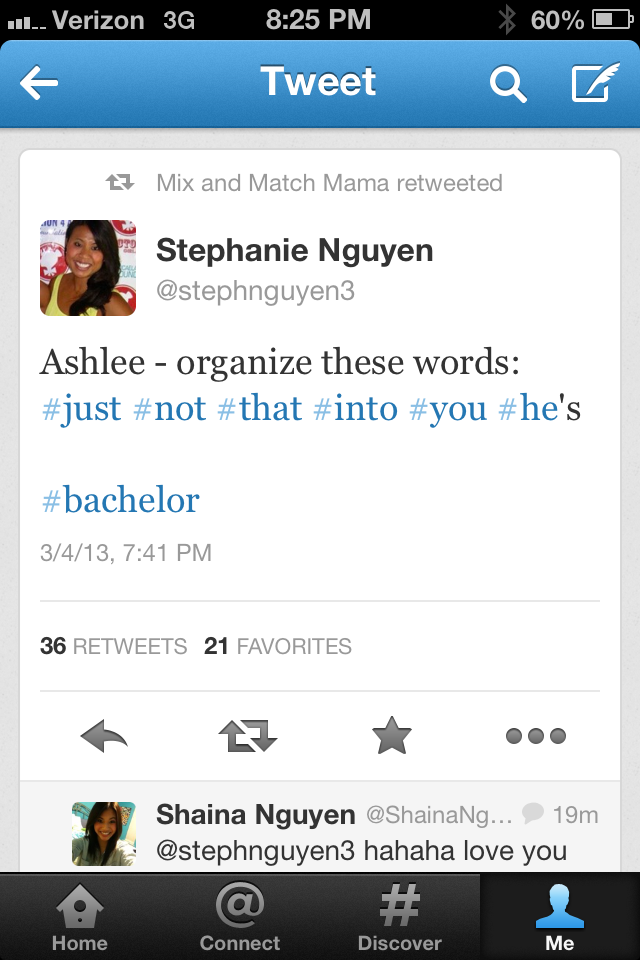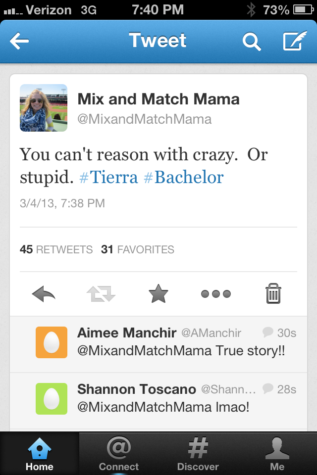 I totally retweeted your crazy tweet! It cracks me up at what you say about the girls especially since you have family involved. GO GIRL!! I'm glad there is bachelor who finally has family that GETS what is going on!