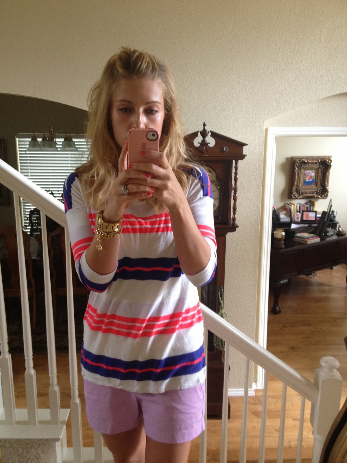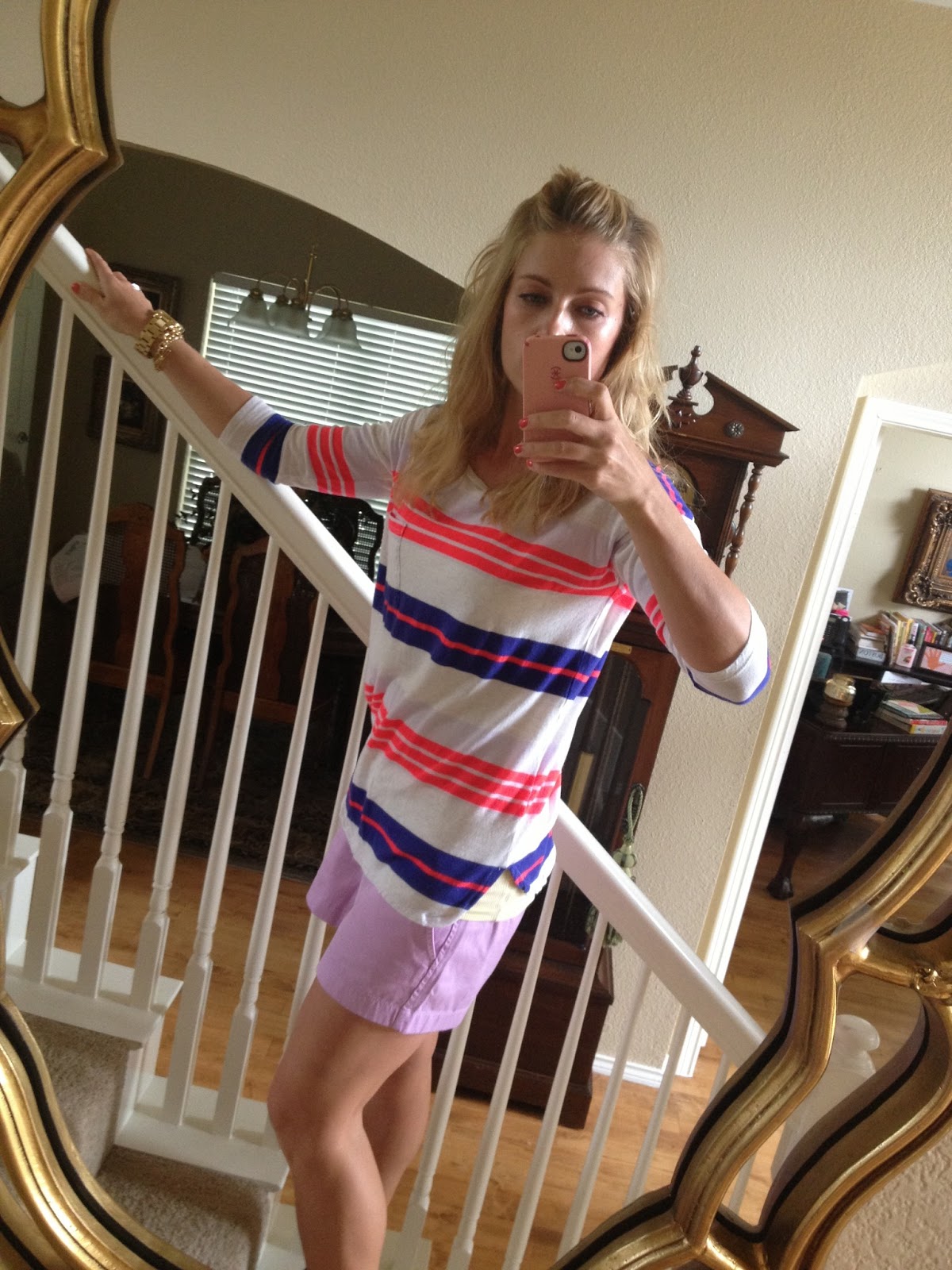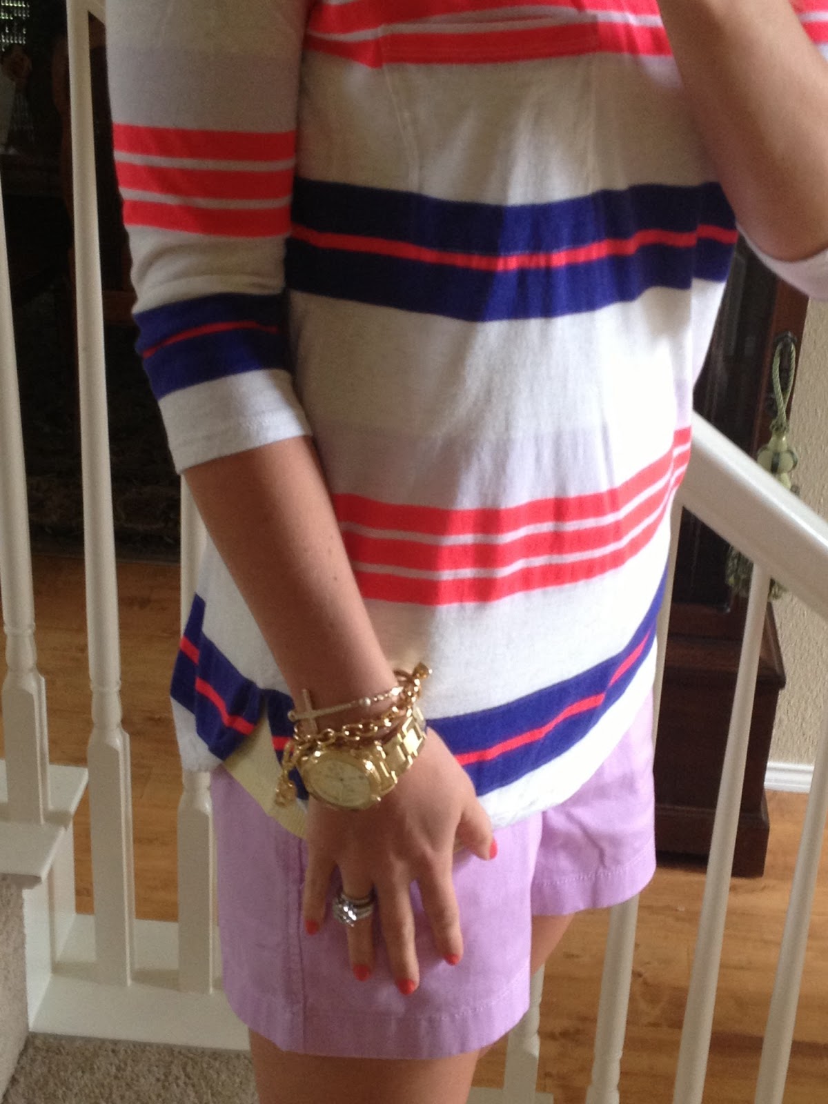 I love your neon pink top with the olive shorts and the lavendar shorts with the striped top! I actually have that striped top and wore it just the other day! But I never thought to pair it with that color of shorts!! So cute!! You look great, as always!!