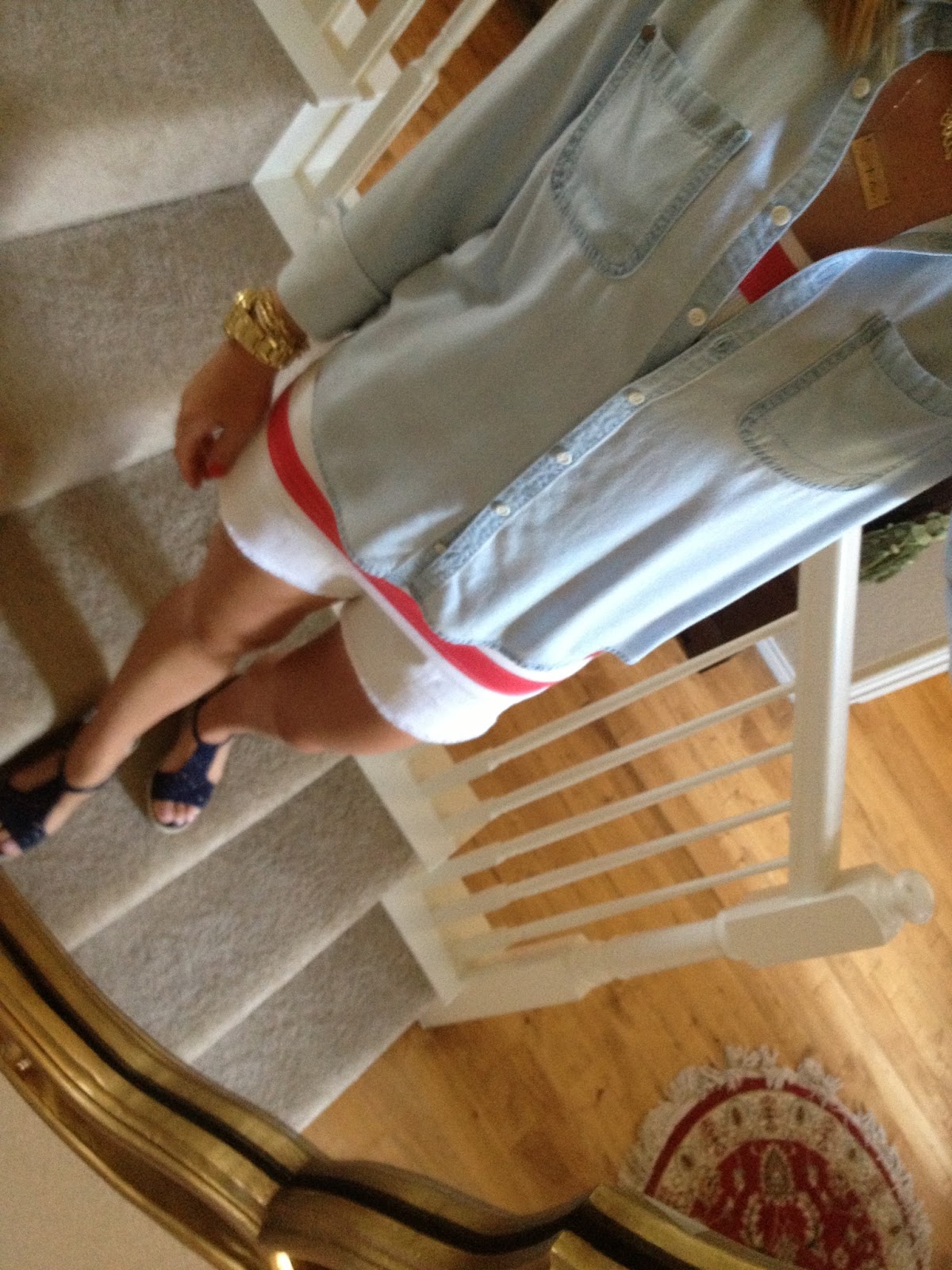 Easy to recreate out of my closet, white shorts, red striped tank, chambray shirt (like) and navy wedges (like).