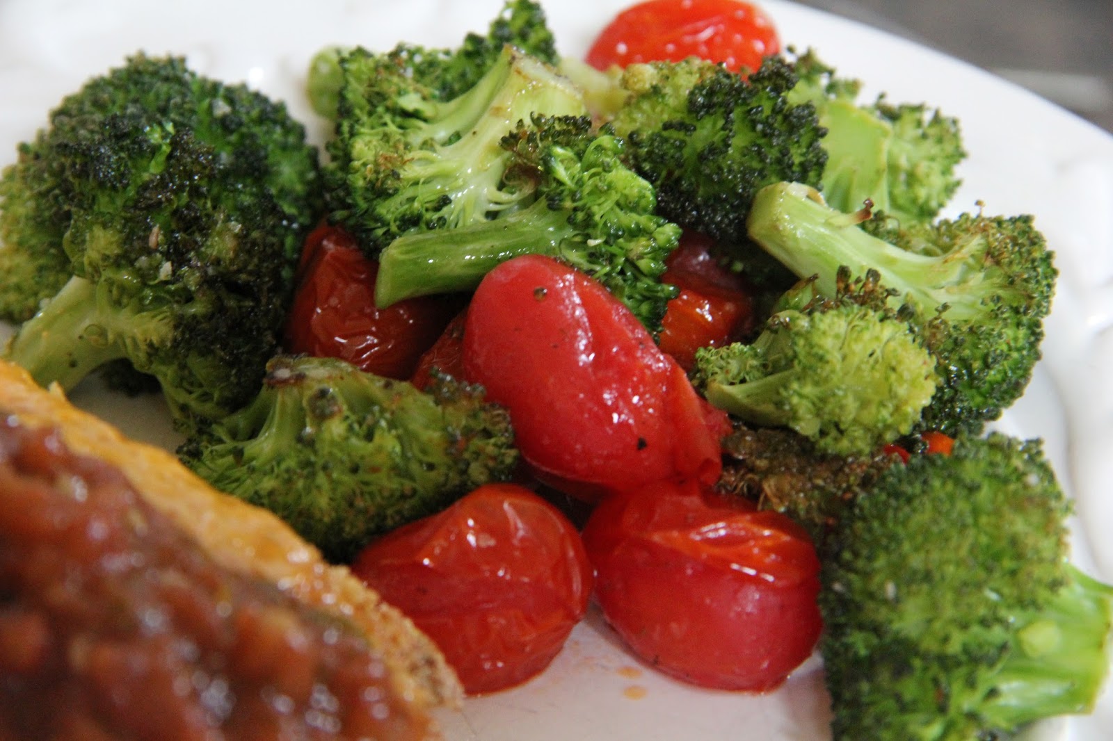 On a foil-lined baking sheet sprayed with Pam (for easy clean up!), spread out your tomatoes and broccoli. Drizzle EVOO down over the tops of your veggies and sprinkle liberally with S&P.