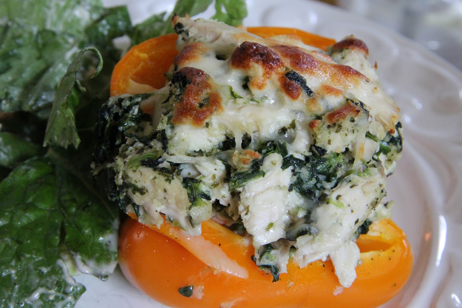 While the peppers are baking, combine your cooked chicken, spinach, pesto, breadcrumbs and 1 cup of Mozzarella cheese in a bowl with a good pinch of S&P.