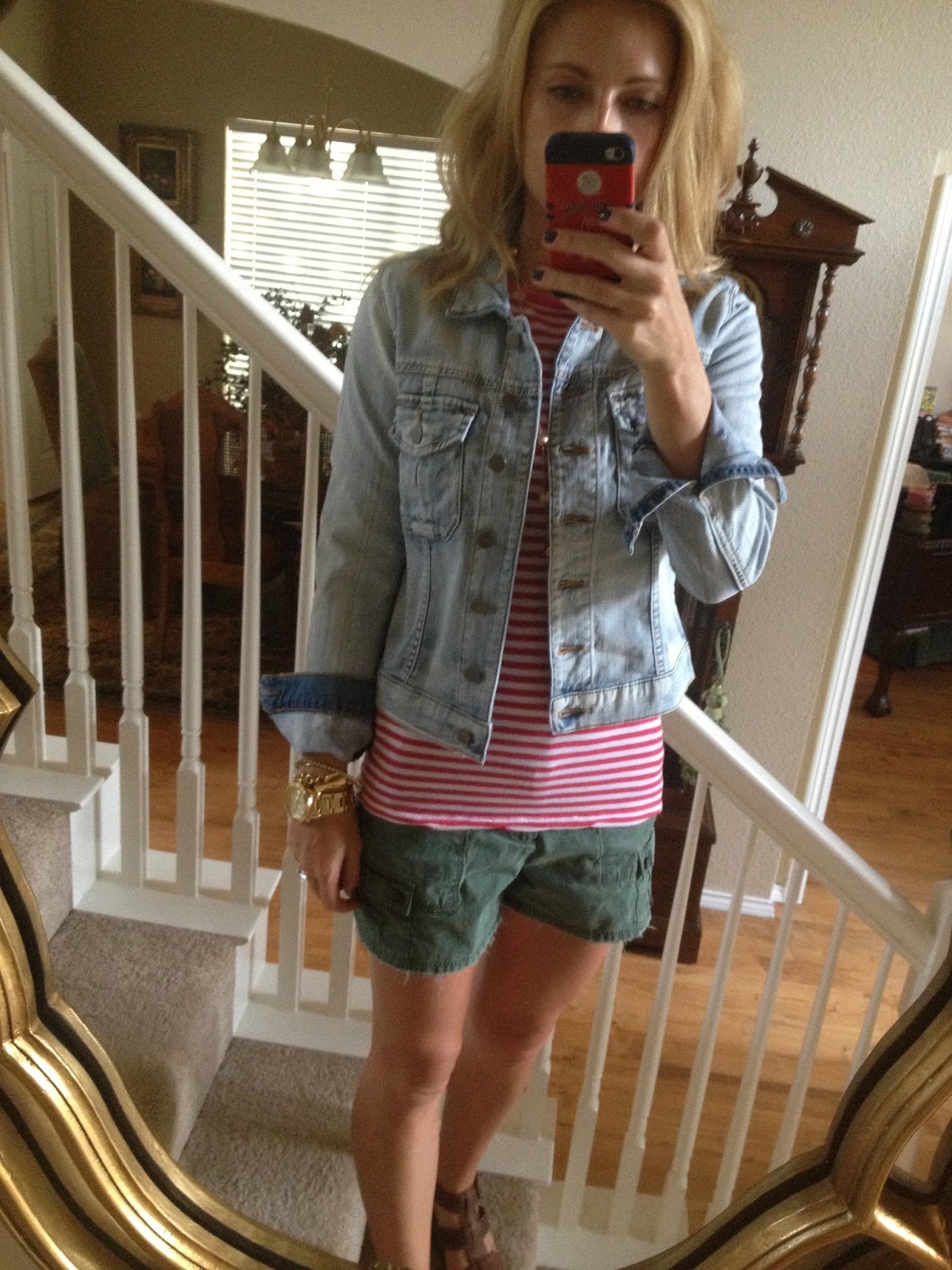 I paired the jacket with my cargo shorts and long-sleeved striped tee. Perfect for September!