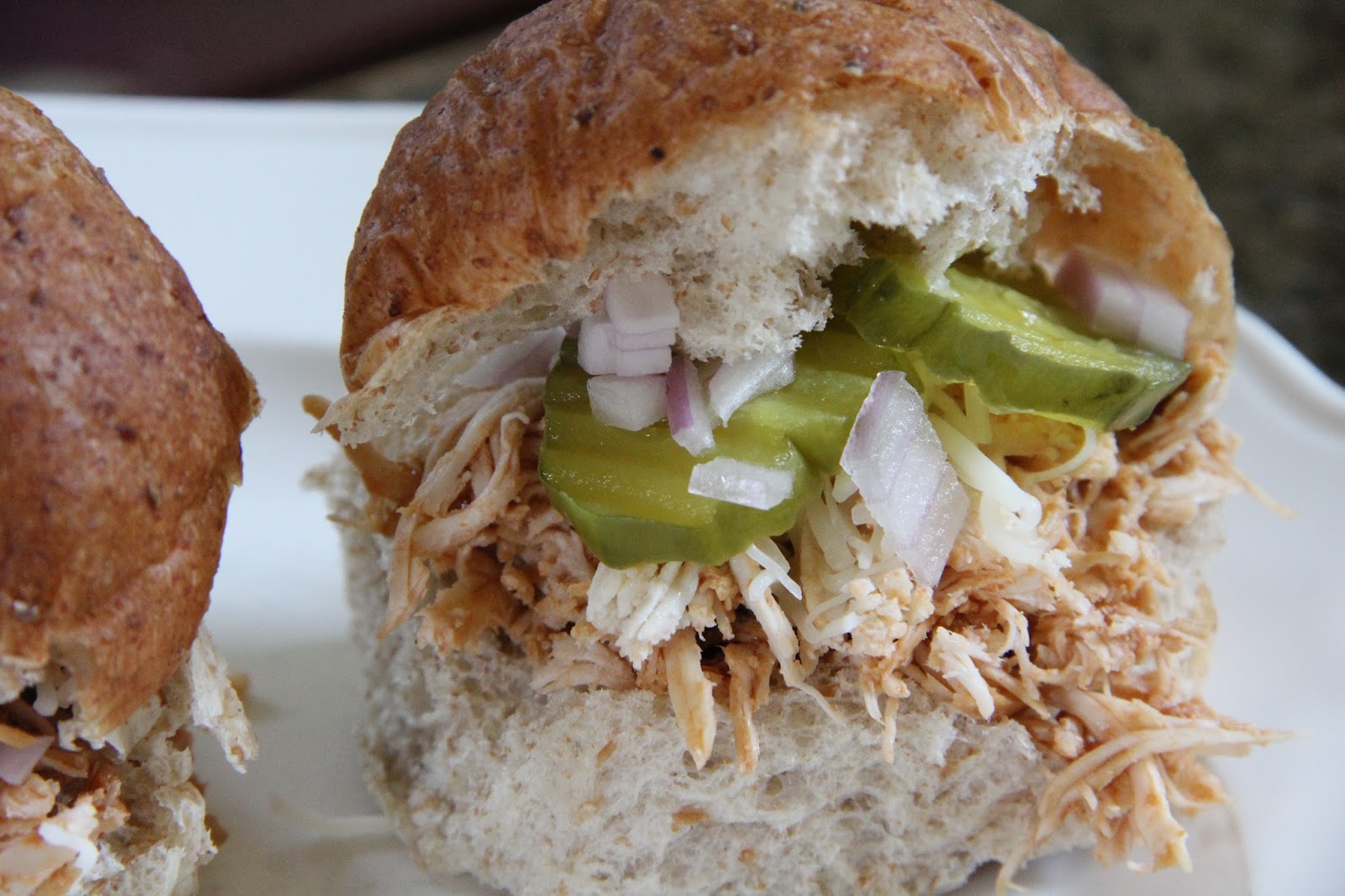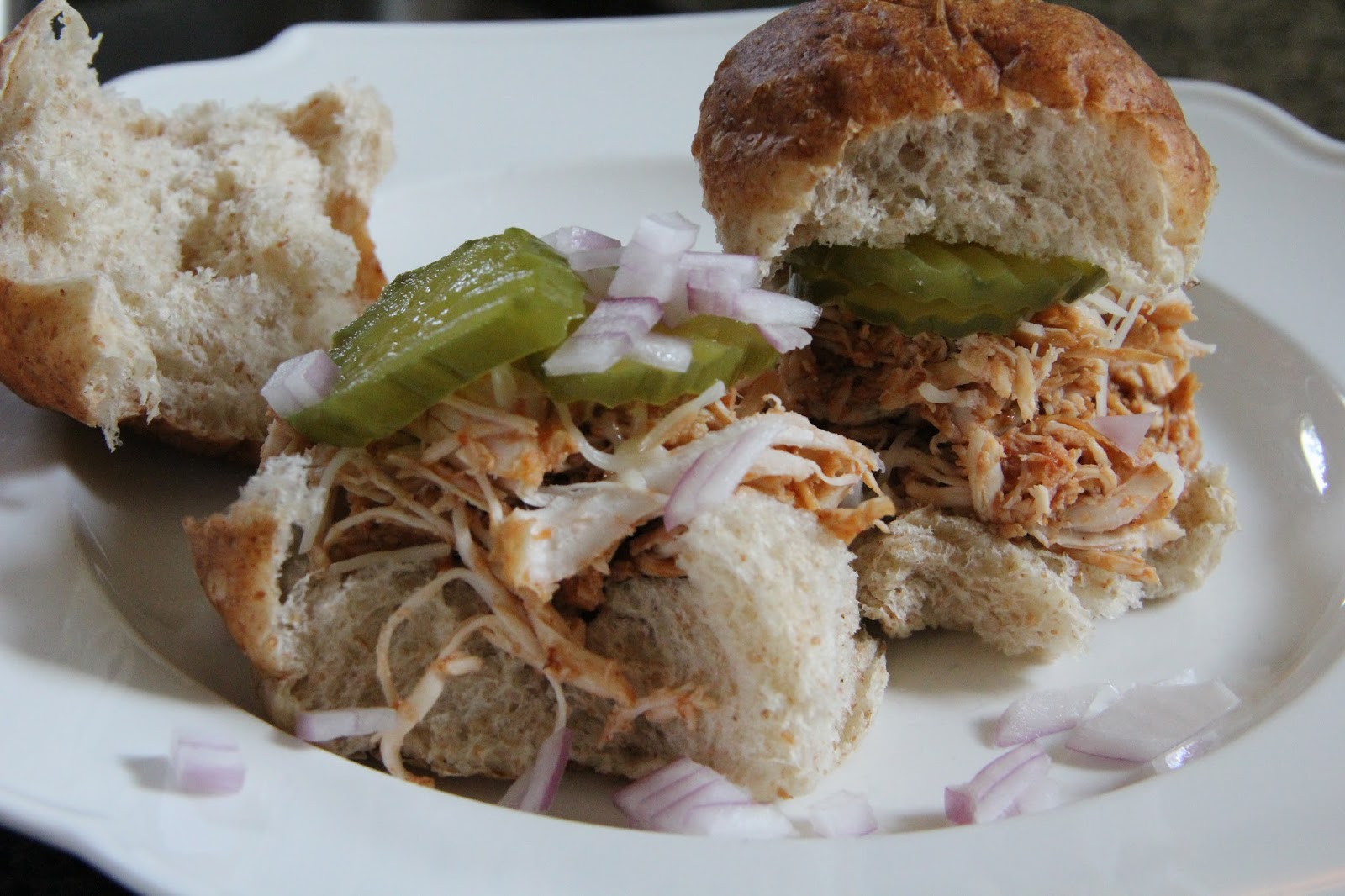Take each dinner roll and top with your chicken mixture. Garnish with cheese, red onion and/or pickles.