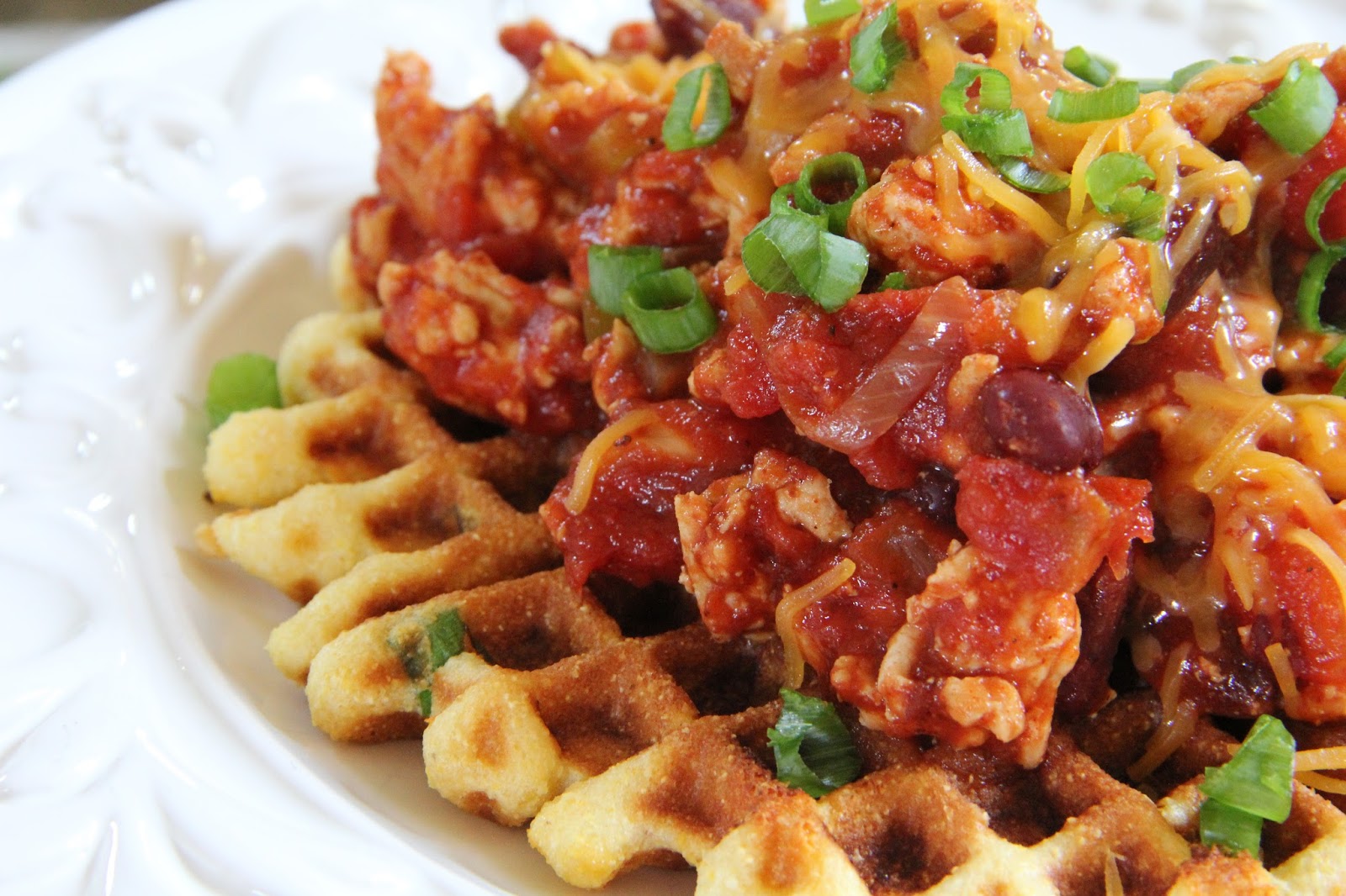 Cook on low 6 to 7 hours or on high 3 to 4 hours. When you’re ready to eat, ladle your chili into either bowls or on top of cornbread waffles.