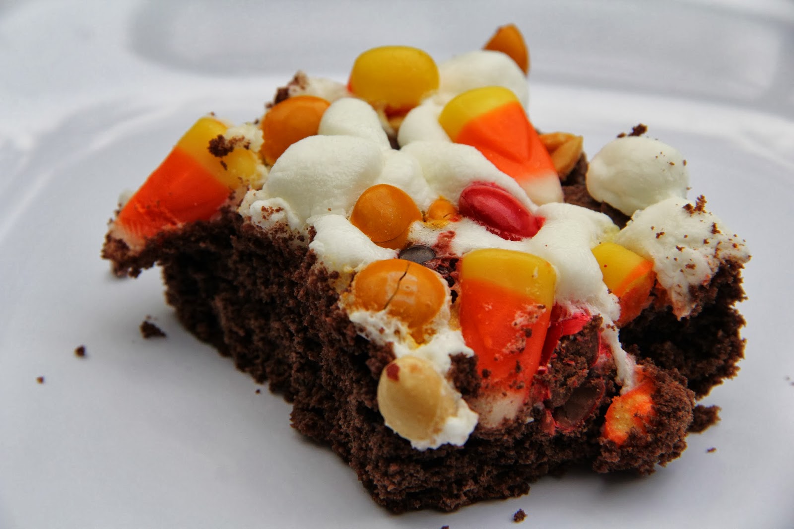 Remove from oven and sprinkle your marshmallows, M&Ms, candy corn and peanuts over the top. Place back in the oven and let the marshmallows melt (about 2 or 3 minutes). Remove and cool completely before slicing and serving.