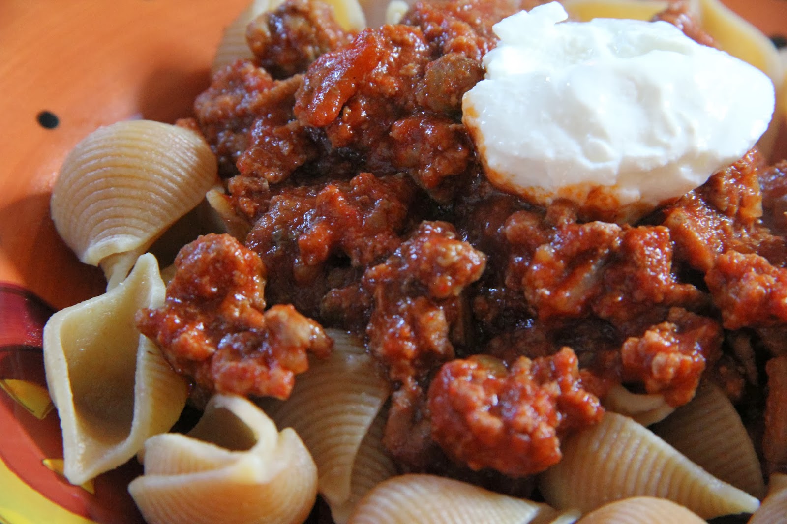 Once you’re ready to serve, spoon your ground beef mixture down over your cooked pasta and garnish with a little dollop on sour cream.