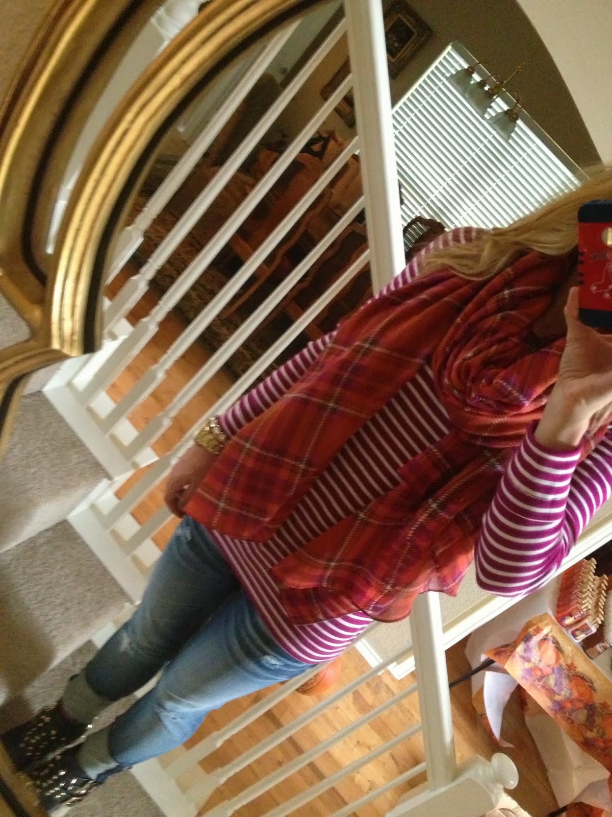 WOW! This is one of my favorite posts you've ever done! I loved all 3 looks! The boyfriend jeans with that amazing tweed jacket? LOVE. And you're right. So fun how you paired the conservative (tweed) with the edgy (distressed boyfriend)! You already know that I love the leopard with the camo. I saw you that day and couldn't believe how good it looked! And the pink stripes with that orange scarf? FABULOUS. Seriously great job today! I'M PINSPIRED!!!!!! 🙂