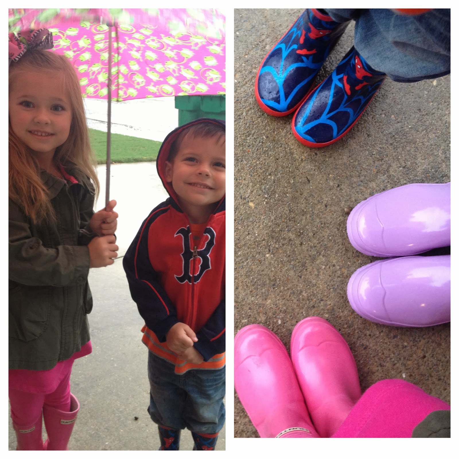 Day 287: I love rainy Mondays!! (And since I know you’ll ask, you can find Kensington’s pink Wellies here, similar purple Wellies here and Smith’s rain boots here.)