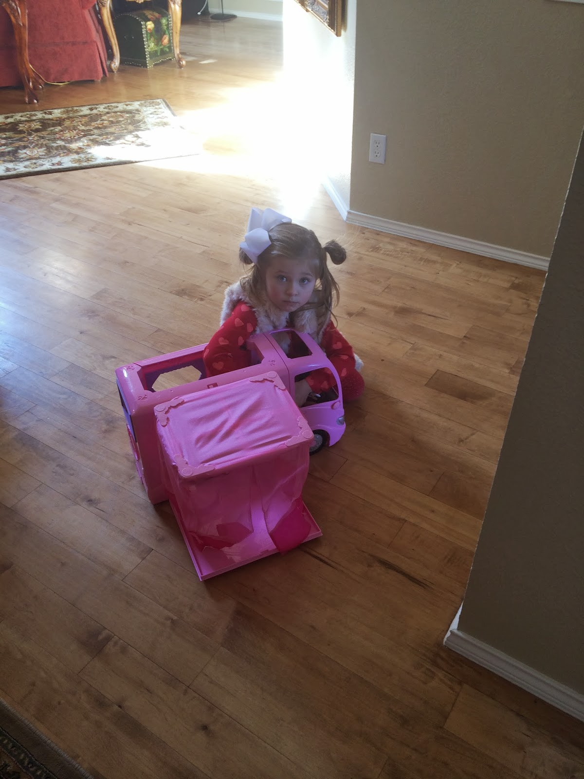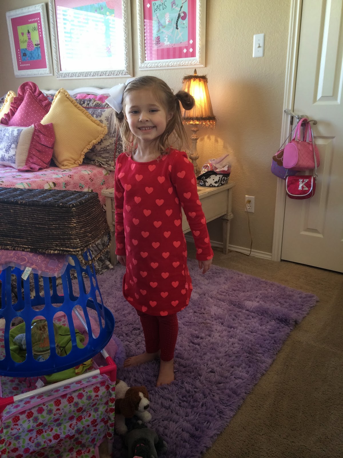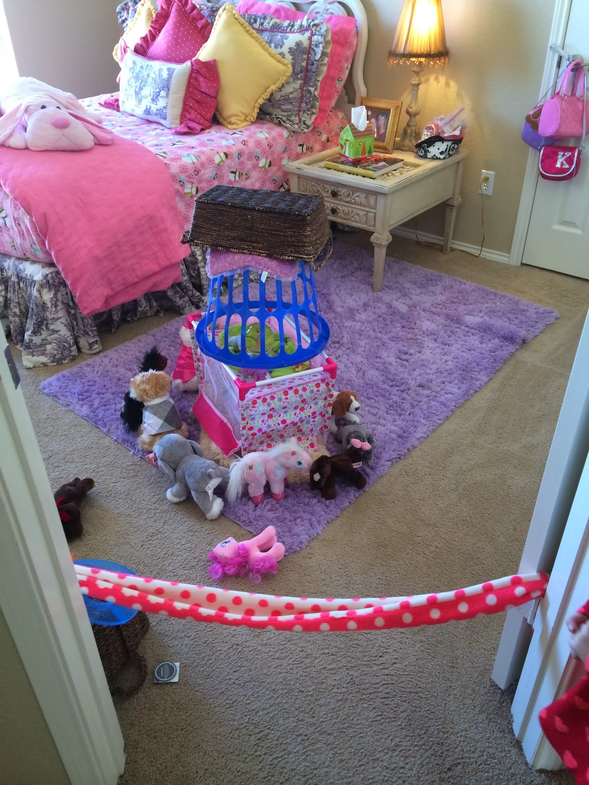 We have a rule at our house that on Sunday nights, we pick up everything and put it back in its place. Every night, we clean up but my kids love creating little caves/tent areas and will play in them all week…so, I let them keep that stuff up all week but they know that on Sunday nights, we hit the restart button and everything goes back up. This was Monday morning…doesn’t Kensington’s room look so nice and clean? Just wait.