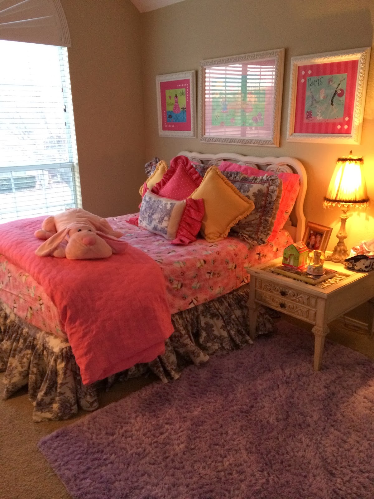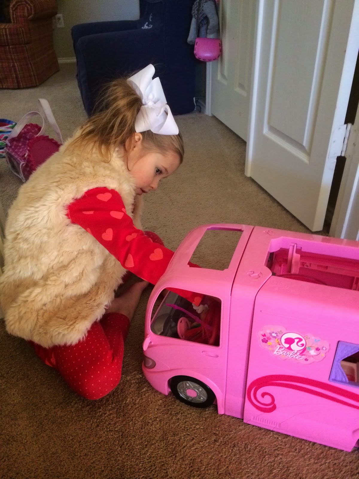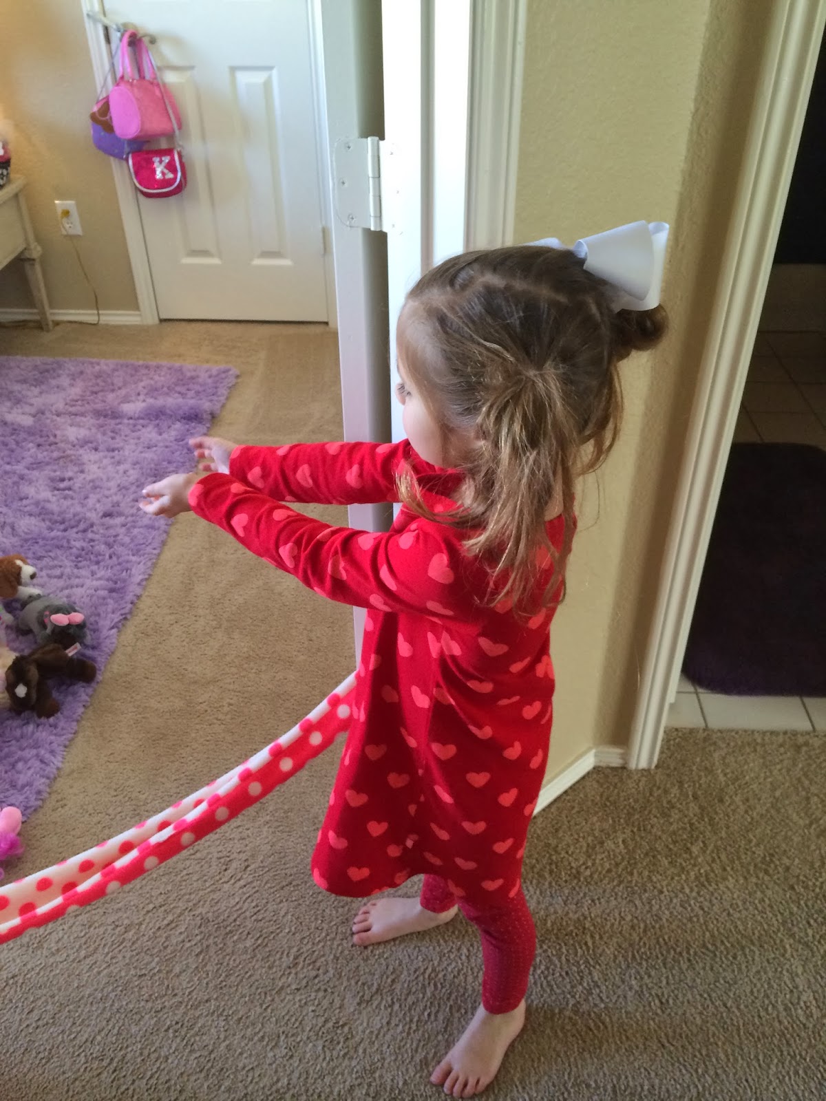 We have a rule at our house that on Sunday nights, we pick up everything and put it back in its place. Every night, we clean up but my kids love creating little caves/tent areas and will play in them all week…so, I let them keep that stuff up all week but they know that on Sunday nights, we hit the restart button and everything goes back up. This was Monday morning…doesn’t Kensington’s room look so nice and clean? Just wait.