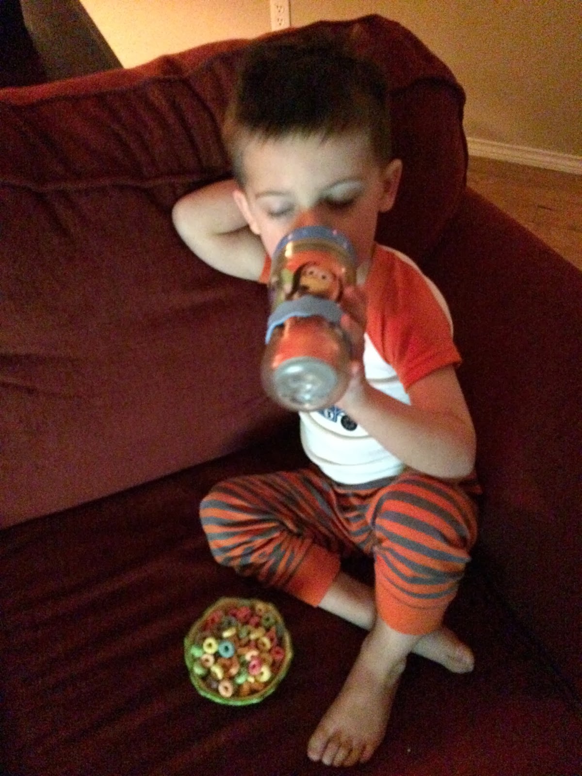 Smith drinking milk and eating Fruit Loops (with his eyes closed).