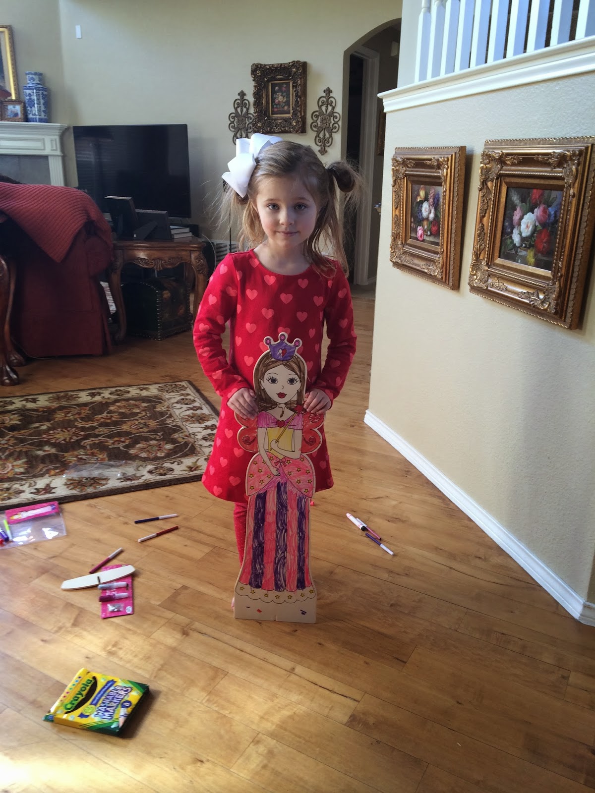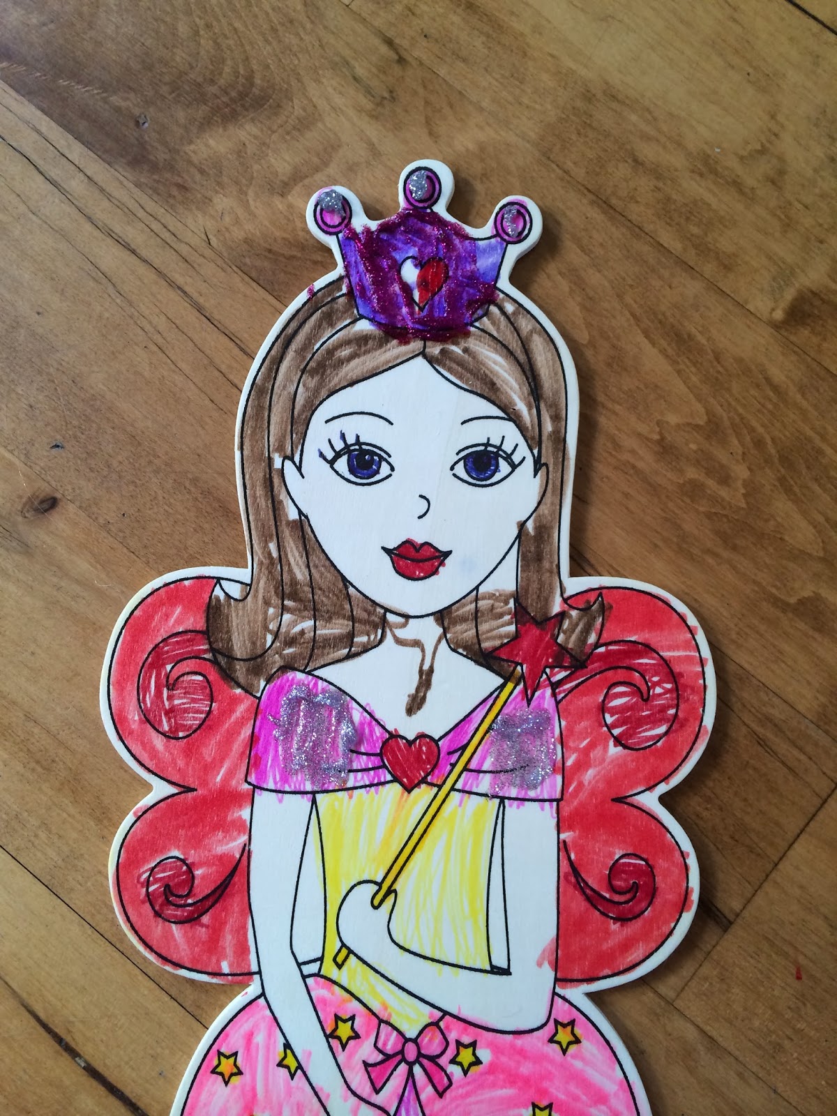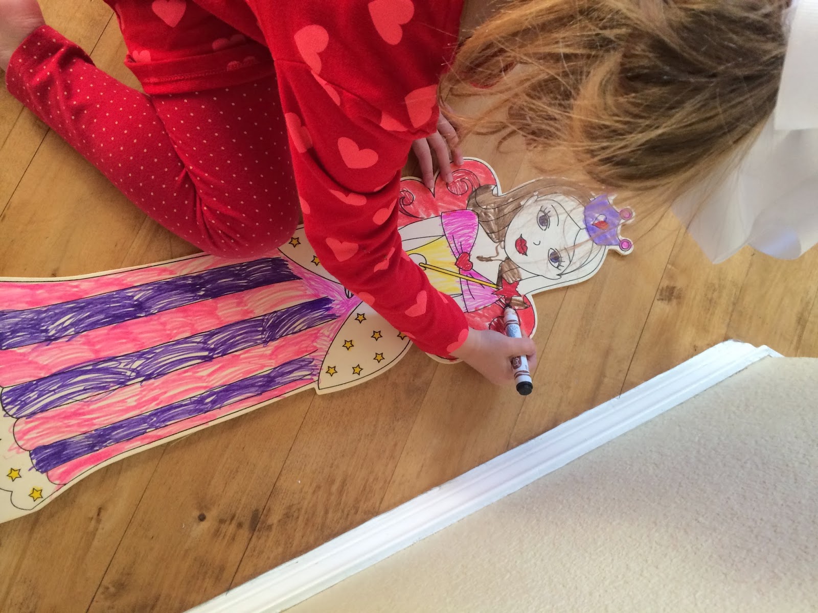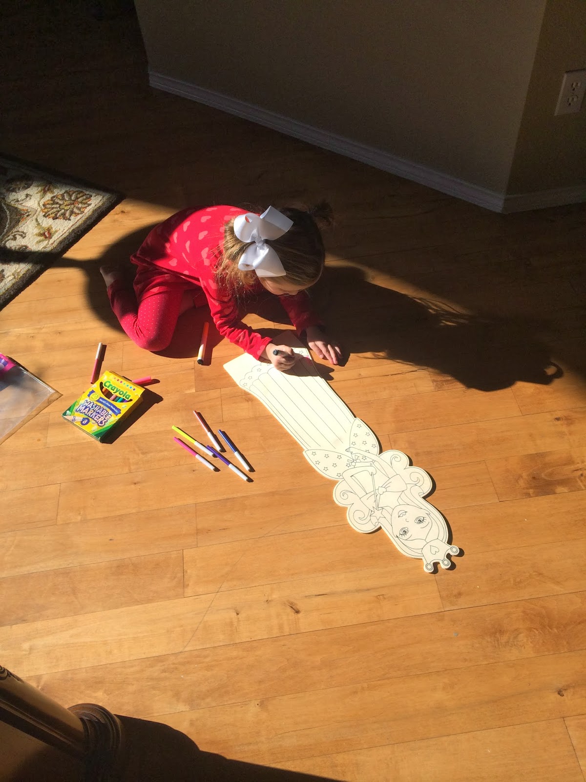 After Kensington turned 5, I stopped insisting she have naps every day. Now, she only takes one if she’s at all cranky that day (which is about once or twice a week). If not, she can have some crafty time. Today, she was coloring her big wooden doll that Santa brought her.