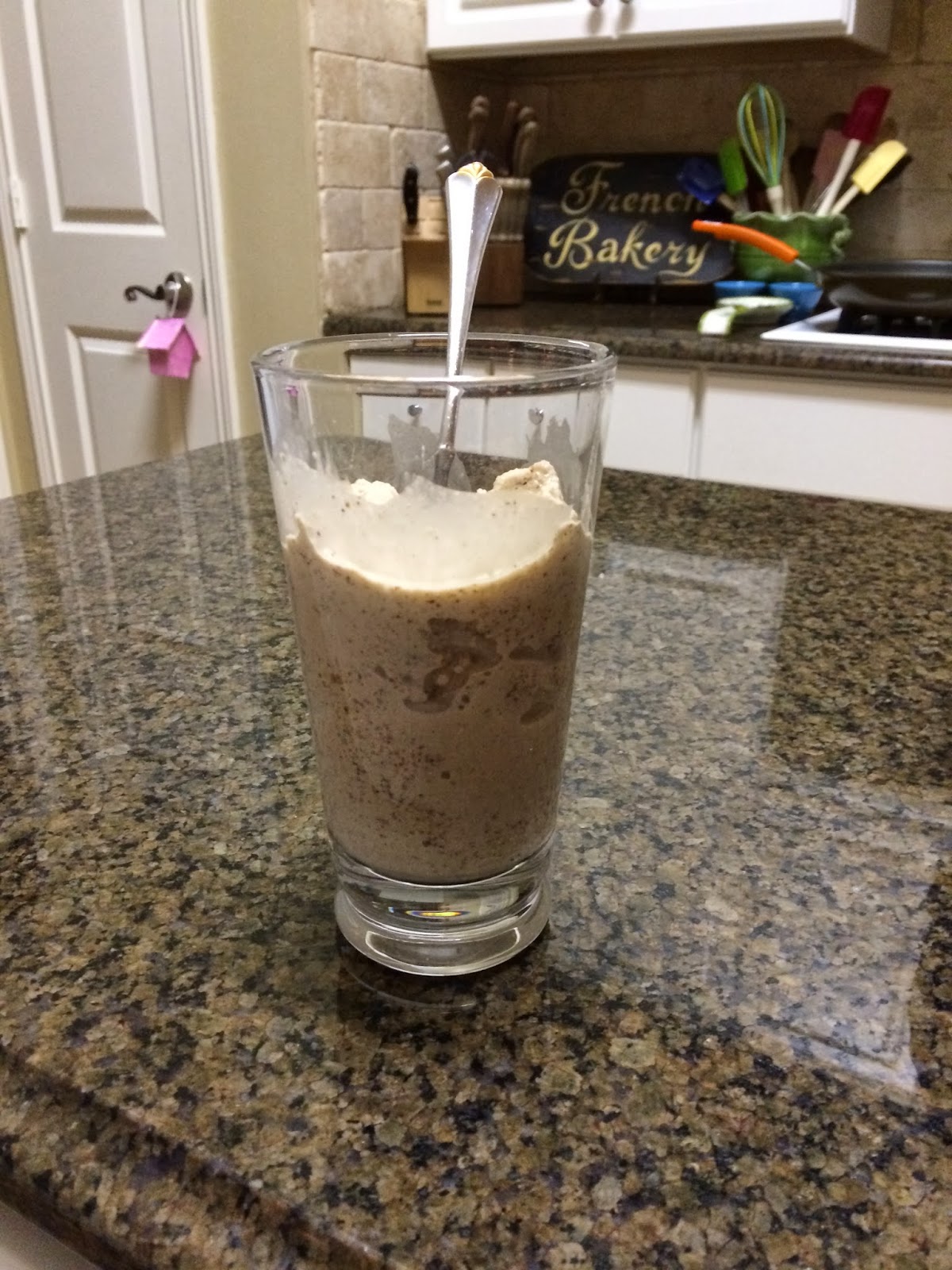 By 6:45, I was making breakfast. On this morning, I made a Almond Butter and Banana Smoothie. It’s one scoop of chocolate Whey protein powder, half a frozen banana, 1/2 cup almond milk, a big scoop of almond butter and lots of ice (right now, my mom is gagging..she prefers Pop Tarts).