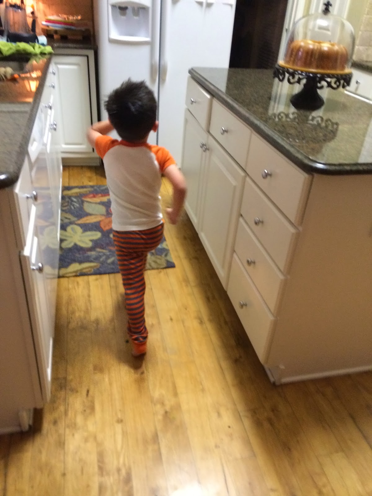 While I clean up after dinner, Andrew always bathes the kids. Thank you Lord for my sweet husband who bathes my kids every night. Seriously, I thank the Lord for him. I knew bath time was over when Smith started marching around the kitchen all clean and in his jammies.