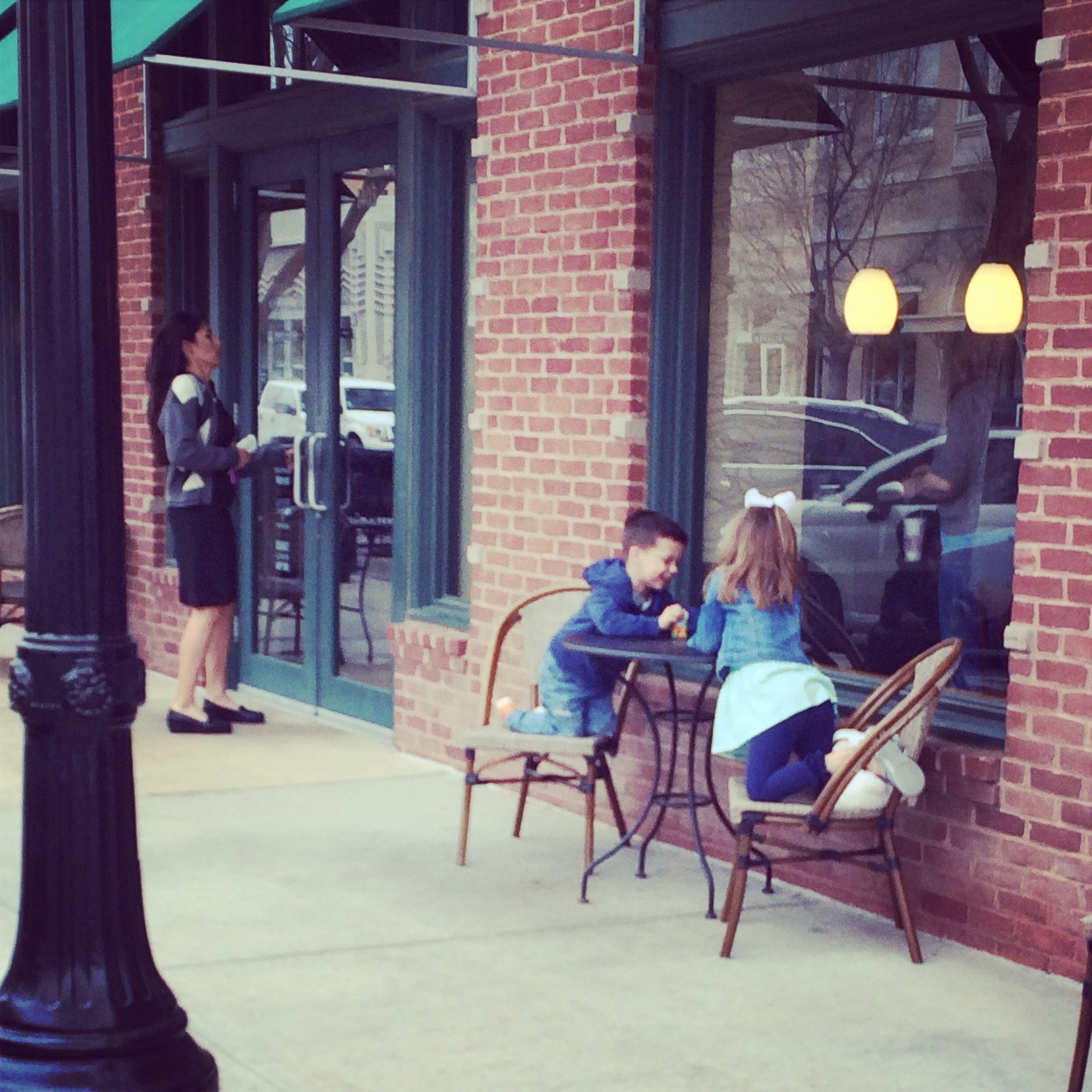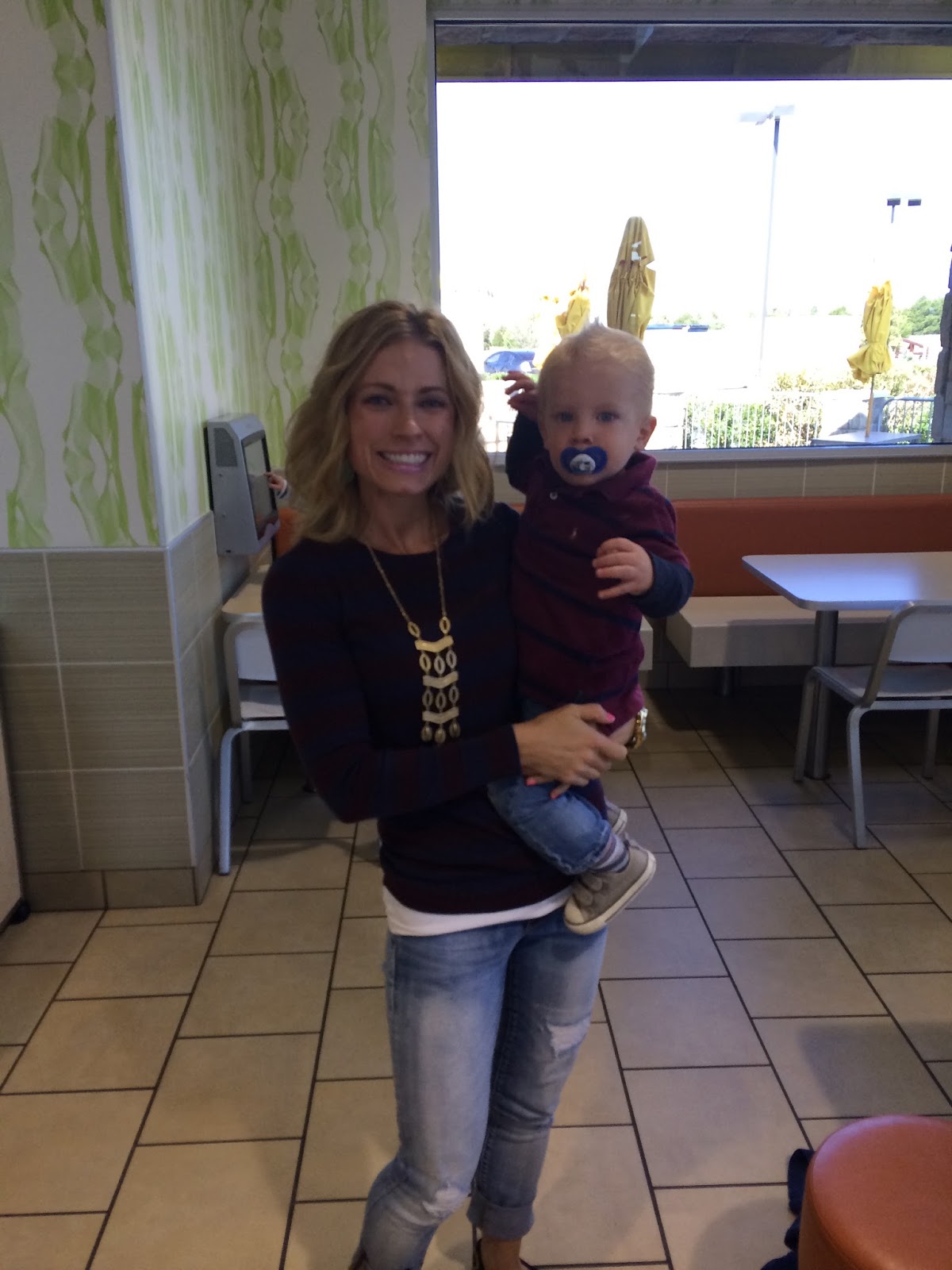 On Monday at McDonald’s, Erika noticed that Bowen and I were dressed alike. We both had on navy and maroon striped shirts with our distressed jeans. Seriously…he could be my kid. I might steal him one of these days! Oh! And you like my necklace?!?! Don’t forget that I’m giving one away right now! Click here for details!