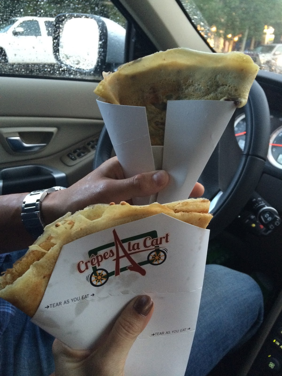 Everyone said we should eat at Crepes a la Cart (this outdoor crepe stand) but it started raining really hard, so Andrew stood in the rain to get our crepes and we ate them in the car. Listen, these crepes were the best I’ve ever had…and I’m pretty much a crepe eating expert. We ended up having them 3 nights in a row for dessert…sooooo good!