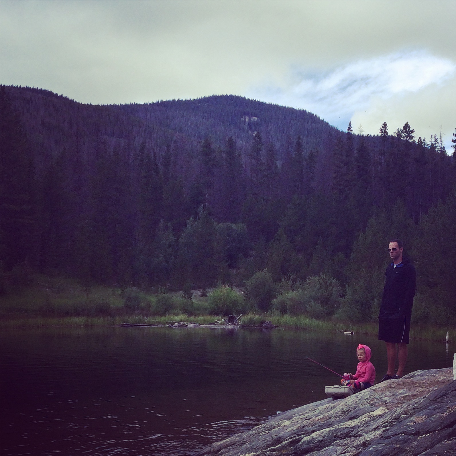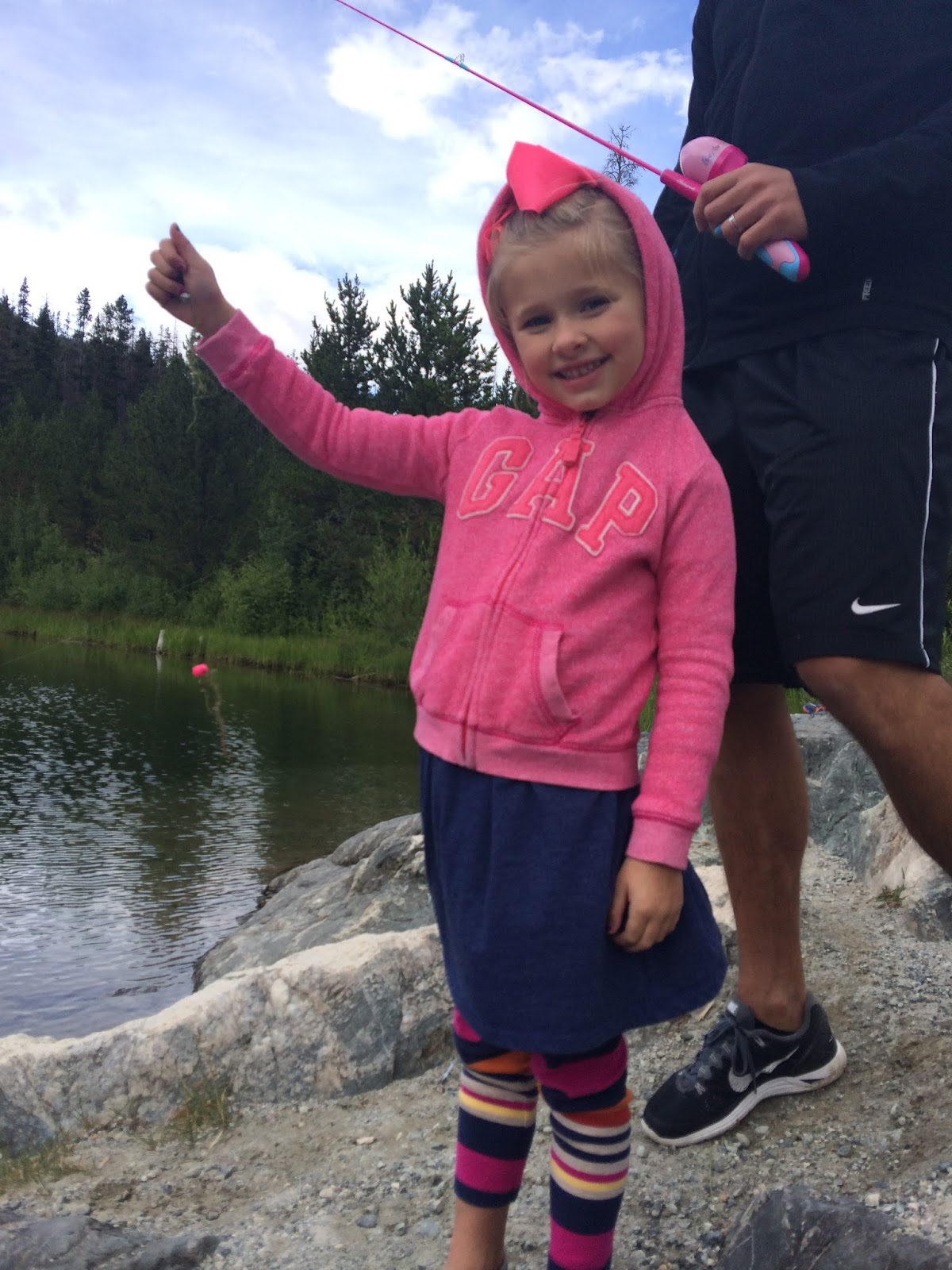 Andrew grew up fishing, so the kids wanted to fish too. We brought the kids rod and reels from home so they could fish. This is how Smith fished…cookie in hand, rod on leg.