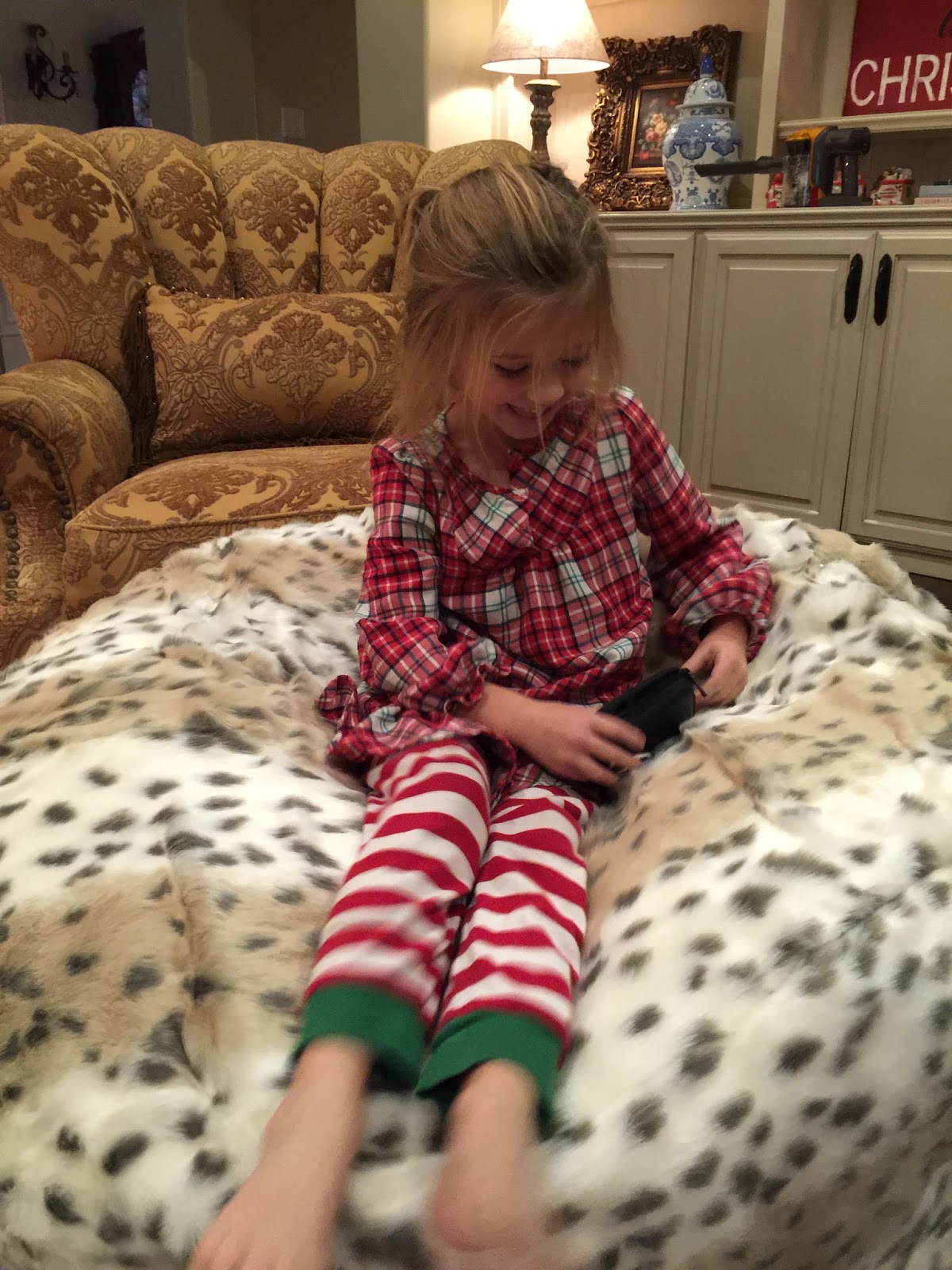 After dinner, we drove around Highland Park in Dallas and looked at lights. Kensington asked us at least every minute where Santa was (we were checking a Santa tracker app)…she was so nervous that we would stay out too late and miss him!