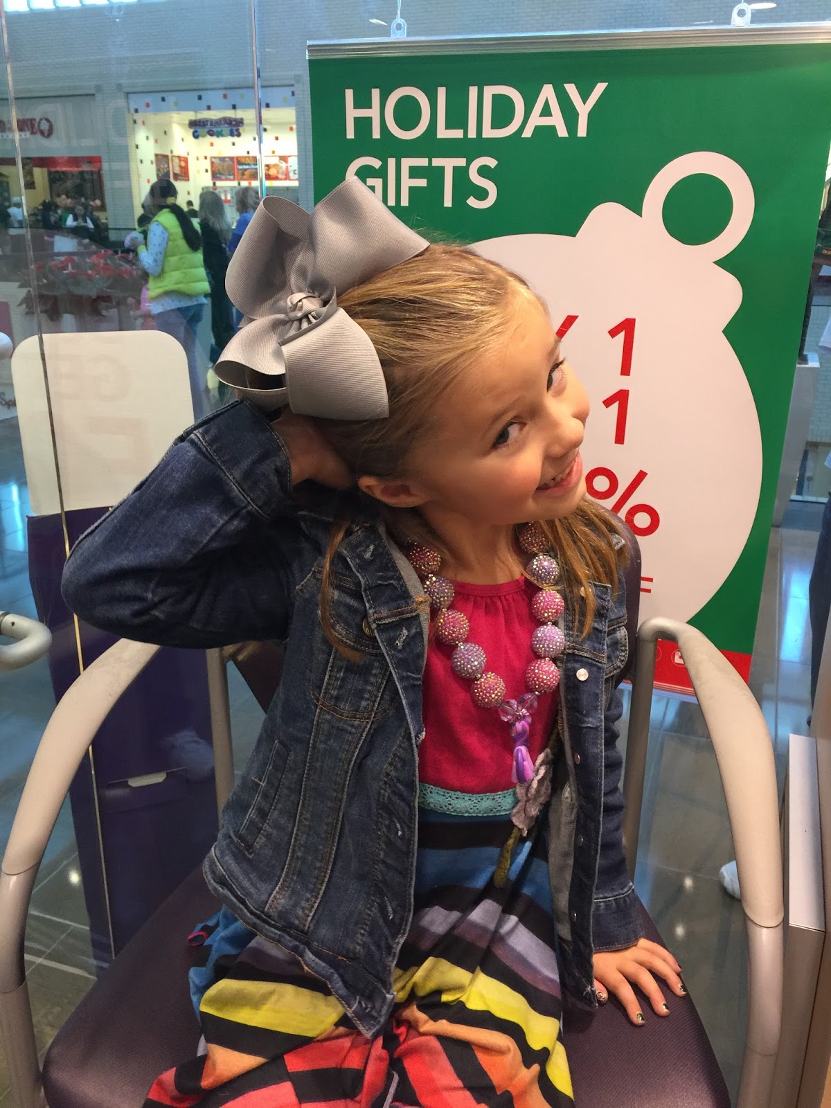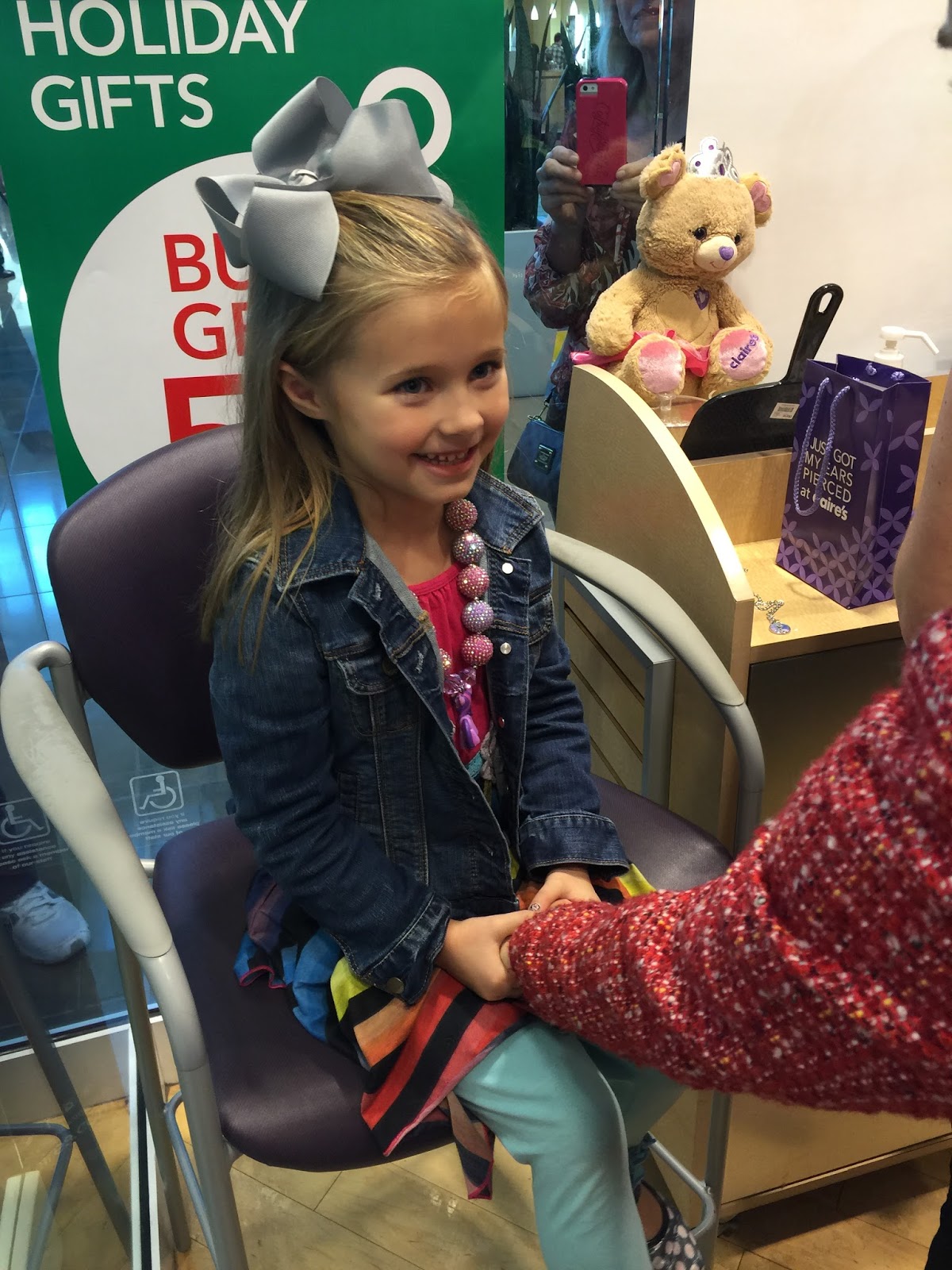 We were going to meet my parents at one of our very favorite restaurants in Dallas and then see lights (an annual tradition), but before, we went to North Park Mall just to see it all decked out…well, Kensington asked (for the first time) if she could get her ears pierced. I said I wasn’t sure (she’s never asked!) and that daddy would say no (he’s super strict about that stuff)…well, she asked Andrew and he was like “I guess” (his first rodeo as a girl dad).