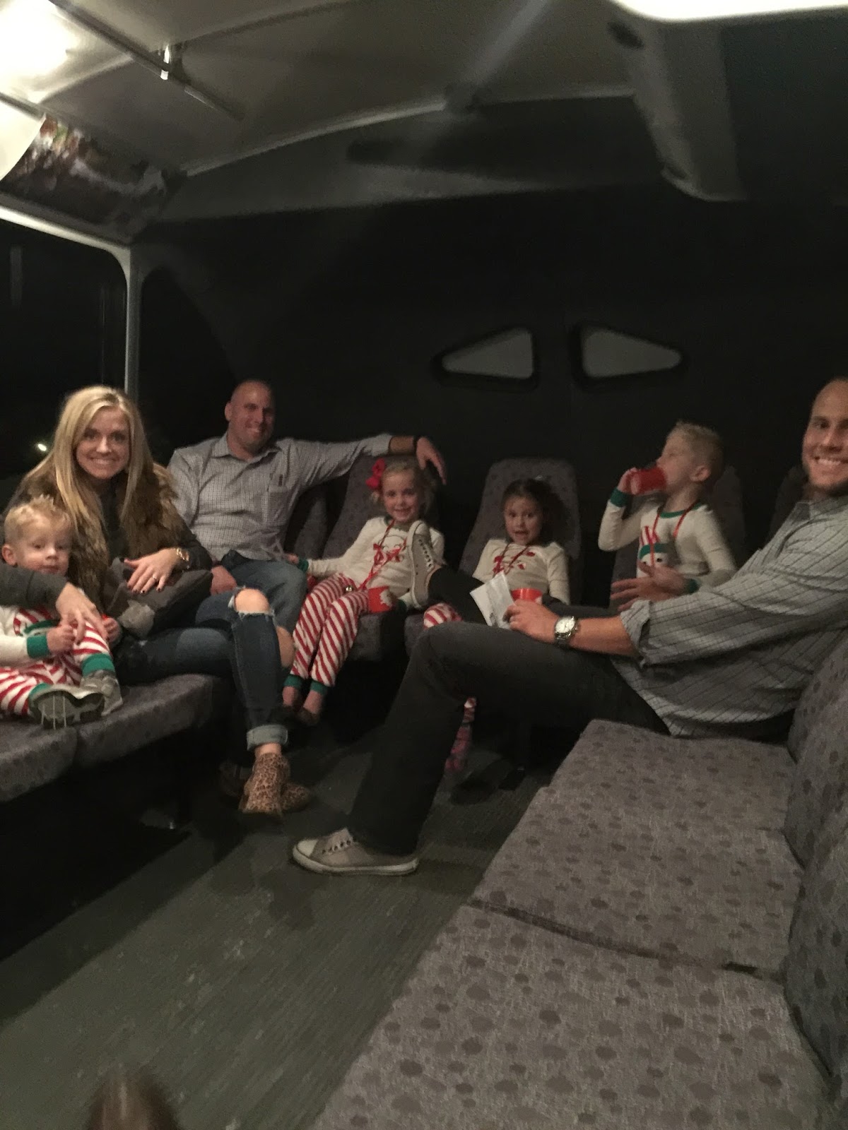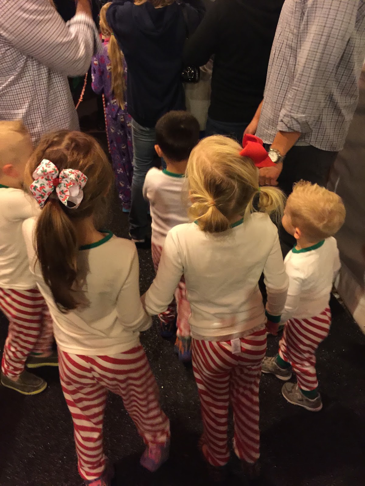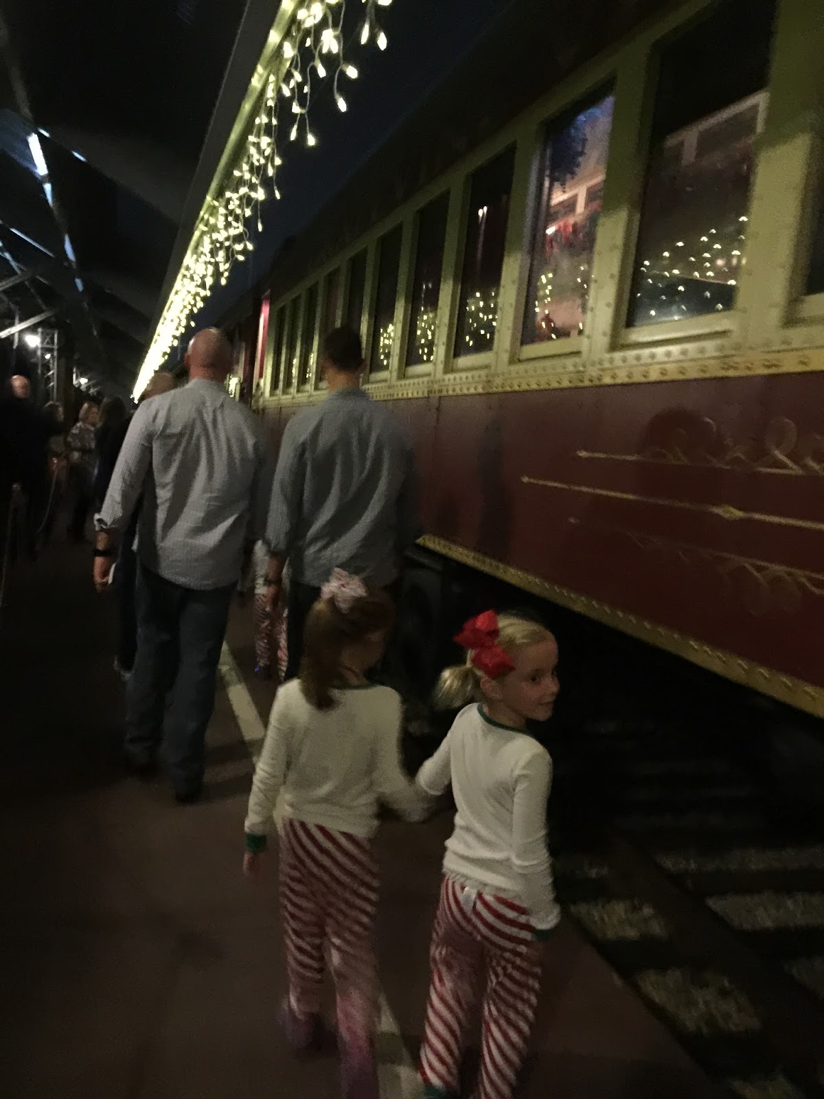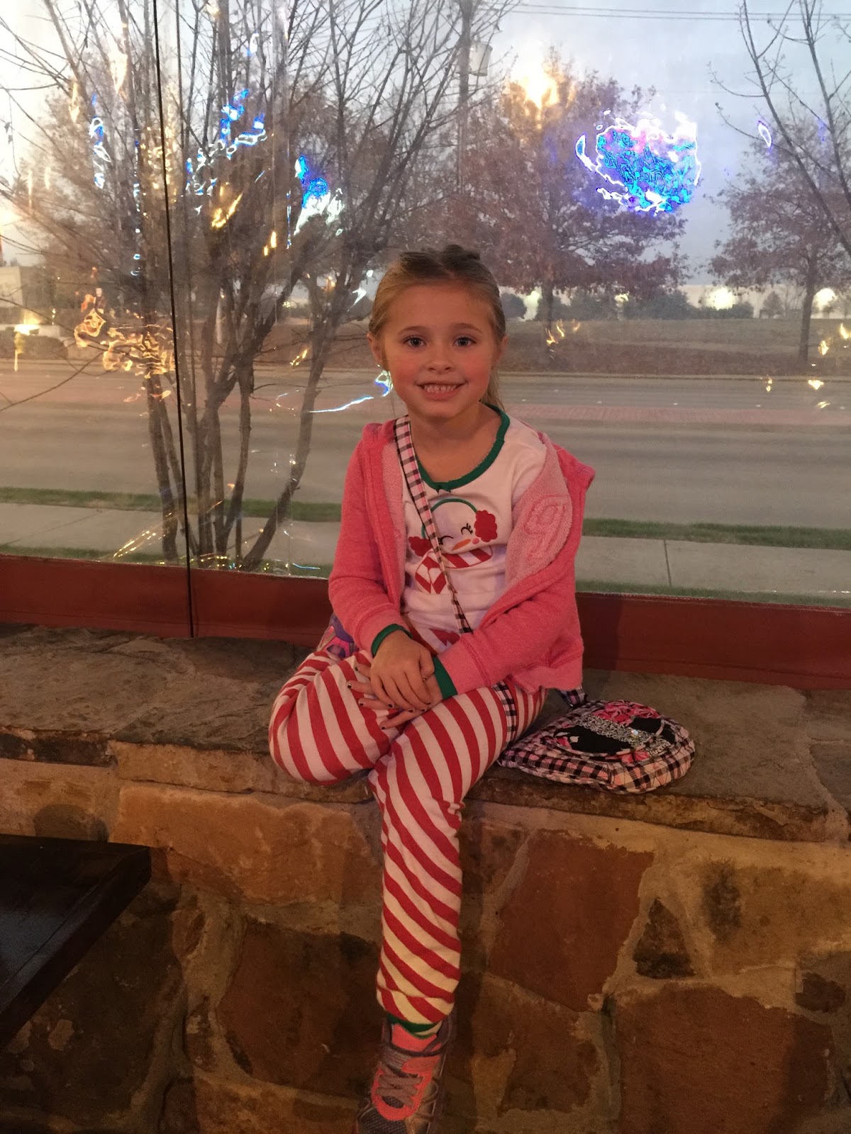 The kids all wear their pjs on the Polar Express, so we dressed the five kiddos in matching pajamas. We ate yummy BBQ at a nearby restaurant before boarding the train. My big girl :).